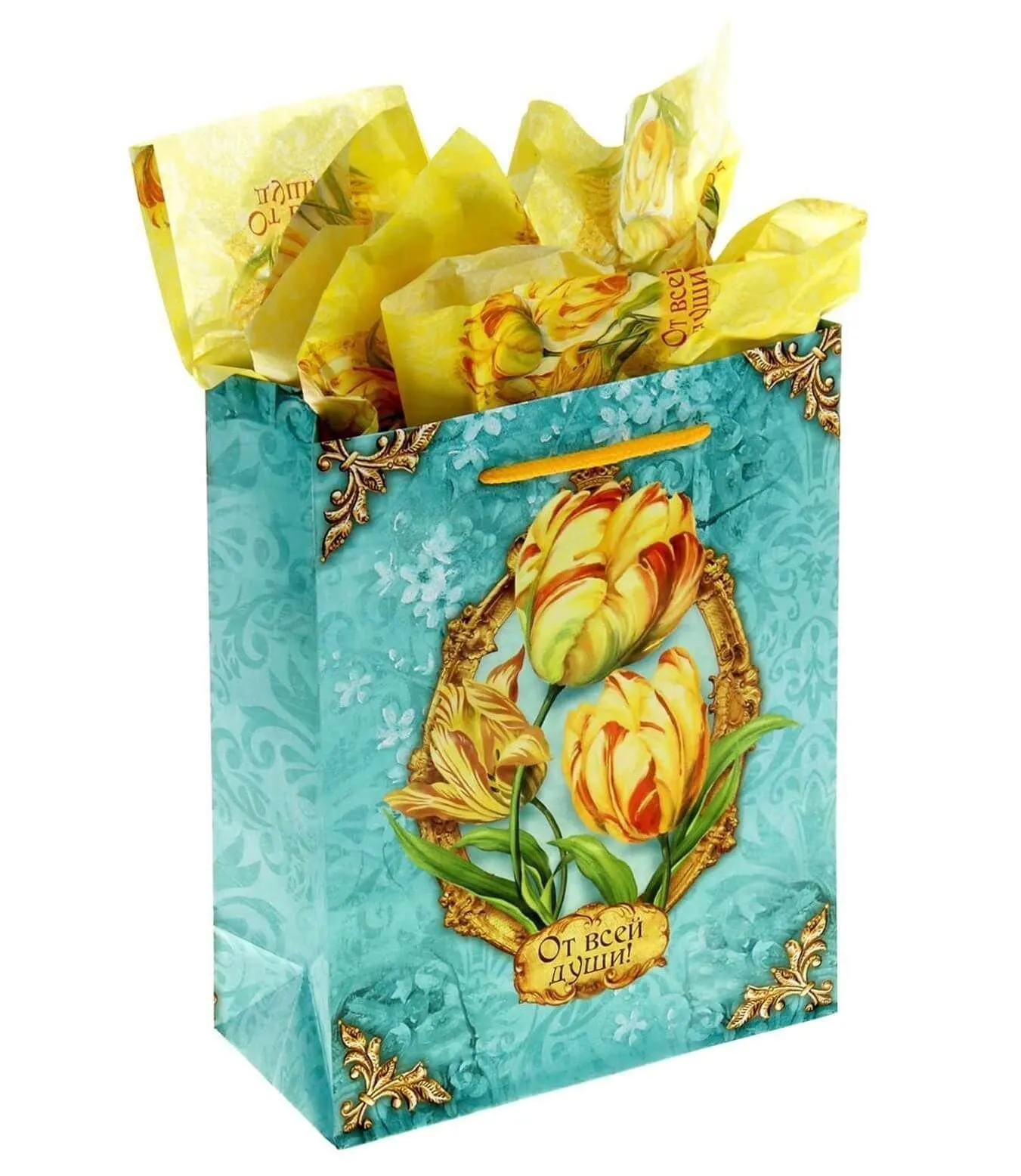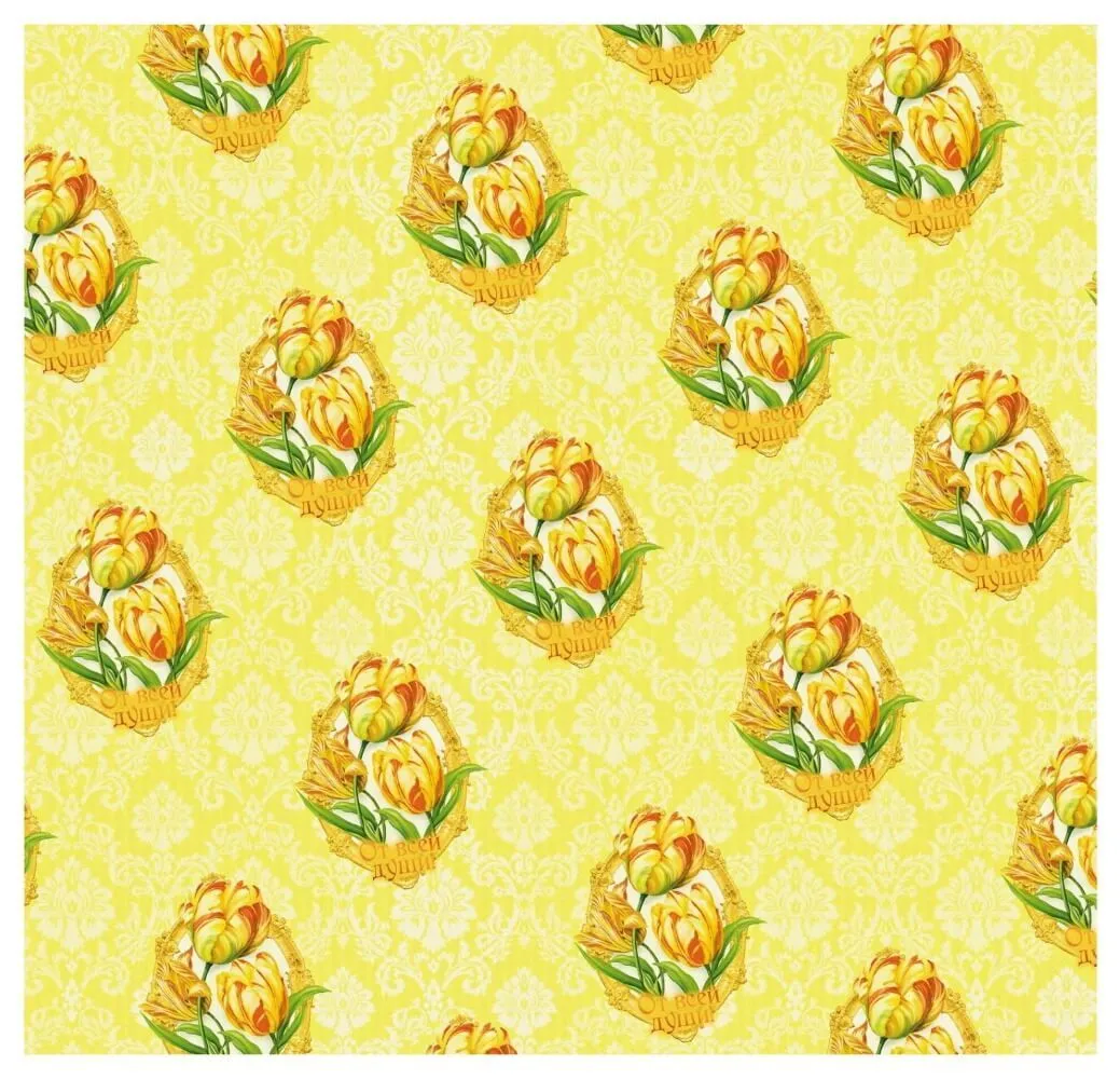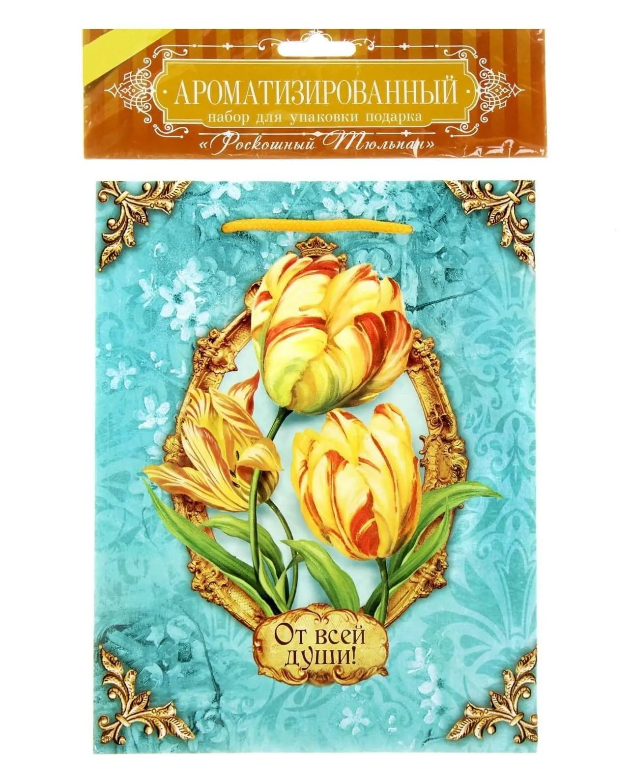 В набор "Роскошный тюльпан" от компании Сима Ленд входят ламинированный пакет и бумага тишью, с изображенными на них прекрасными желтыми тюльпанами. Секрет упаковочной бумаги заключается в наличии у нее нежного аромата тюльпанов, который пробудит только нежные чувства своим благоуханием.