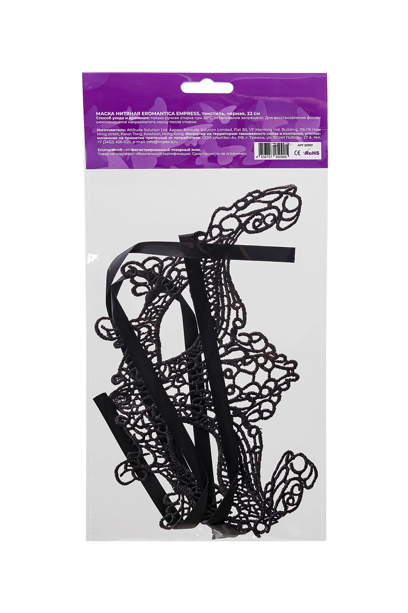 —Маска нитяная Eromantica Empress, текстиль, черная, 22 см