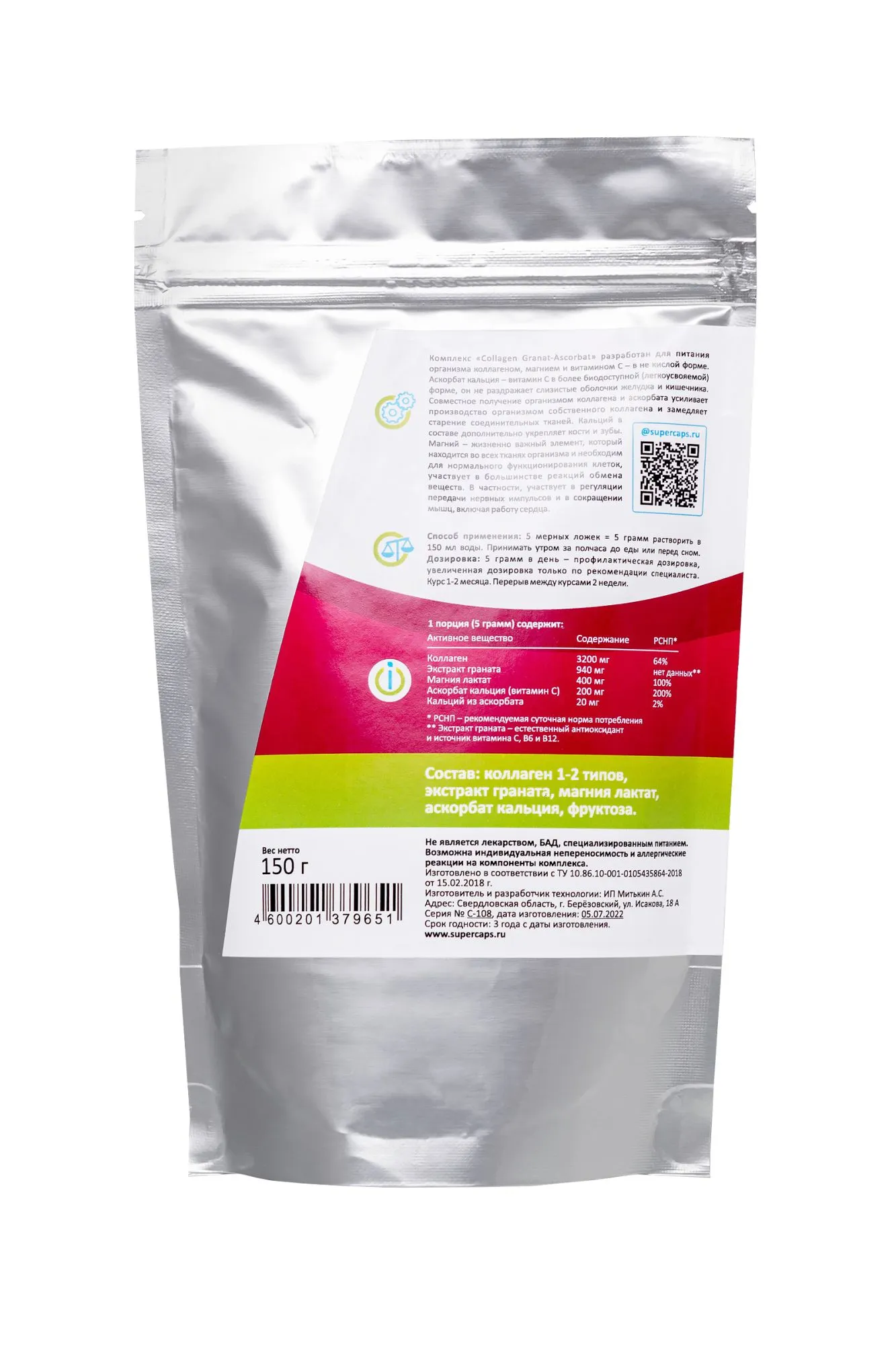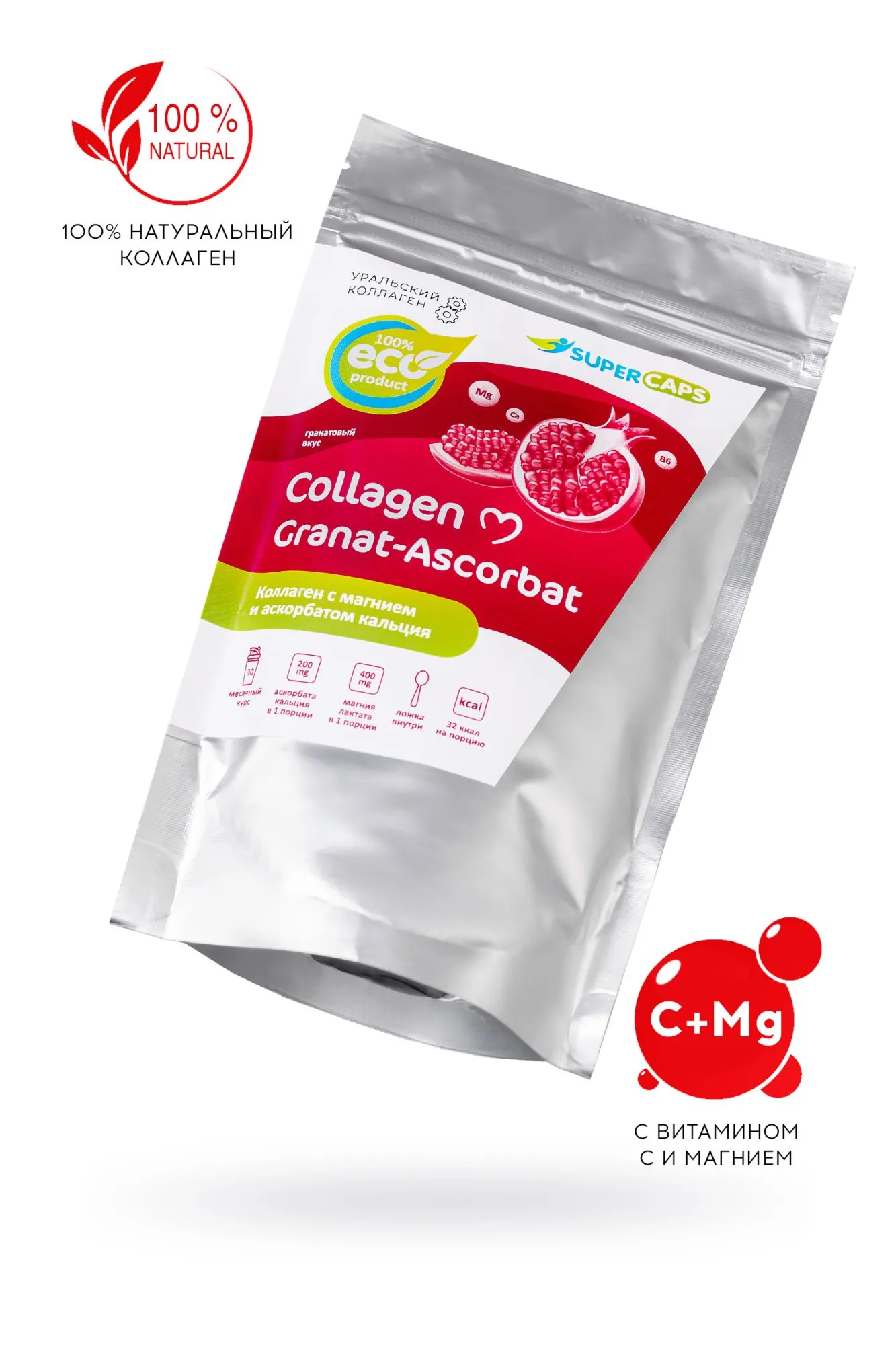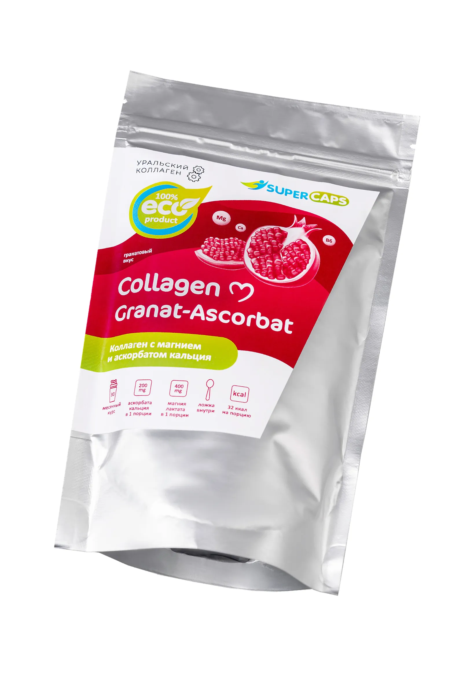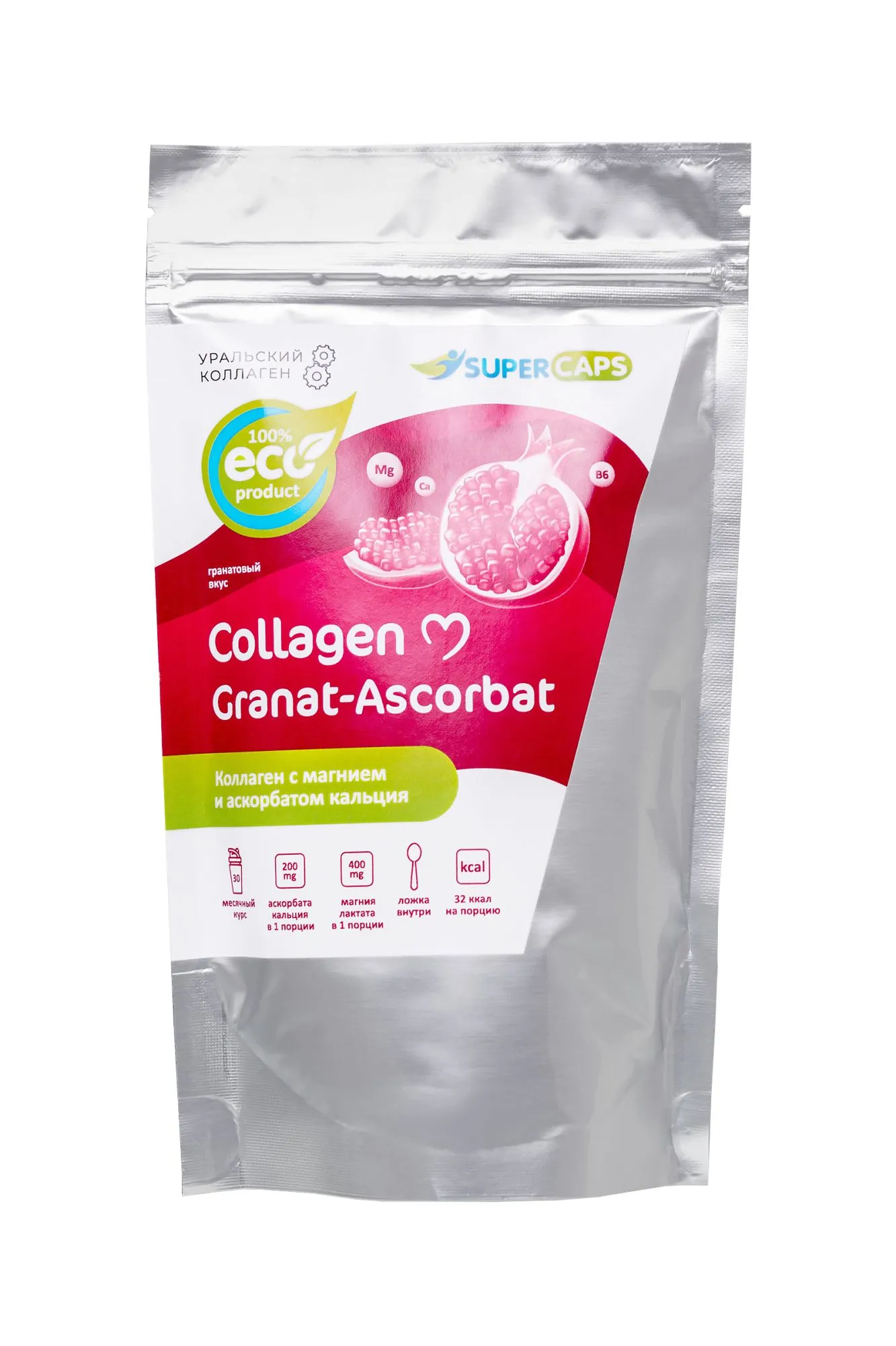Комплекс Collagen Granat-Ascorbat SuperCaps – новейший beauty-продукт для питания организма коллагеном, магнием и витамином С. Аскорбат кальция – тот же витамин С в более легкоусвояемой форме, не кислой форме. Благодаря этому слизистые оболочки желудка и кишечника не раздражаются. Сочетание коллагена и аскорбата усиливает производство организмом собственного коллагена и замедляет старение соединительных тканей. Магний – жизненно важный элемент, который находится во всех тканях организма и необходим для нормального функционирования клеток, участвует в большинстве реакций обмена веществ, в частности, участвует в регуляции передачи нервных импульсов и в сокращении мышц, включая работу сердца. Кальций в составе дополнительно укрепляет кости и зубы. Способ применения: 5 мерных ложек = 5 грамм. Растворить в 150 мл воды. Принимать утром, за полчаса до еды или перед сном. Дозировка: 5 грамм в день – в профилактических целях, увеличенная дозировка только по рекомендации специалиста. Курс 1-2 месяца, перерыв между курсами 2 недели. 1 порция (5 грамм) содержит: Коллаген - 3200 мг Экстракт граната - 940 мг Магния лактат - 400 мг Аскорбат кальция - 200 мг Кальций из аскорбата - 20 мг Состав: коллаген (I,II типов), экстракт граната-естественный источник витамина С, В6 и В12, магния лактат, аскорбат кальция, фруктоза. Не является лекарством, БАД. Возможна индивидуальная непереносимость и аллергические реакции на компоненты комплекса.