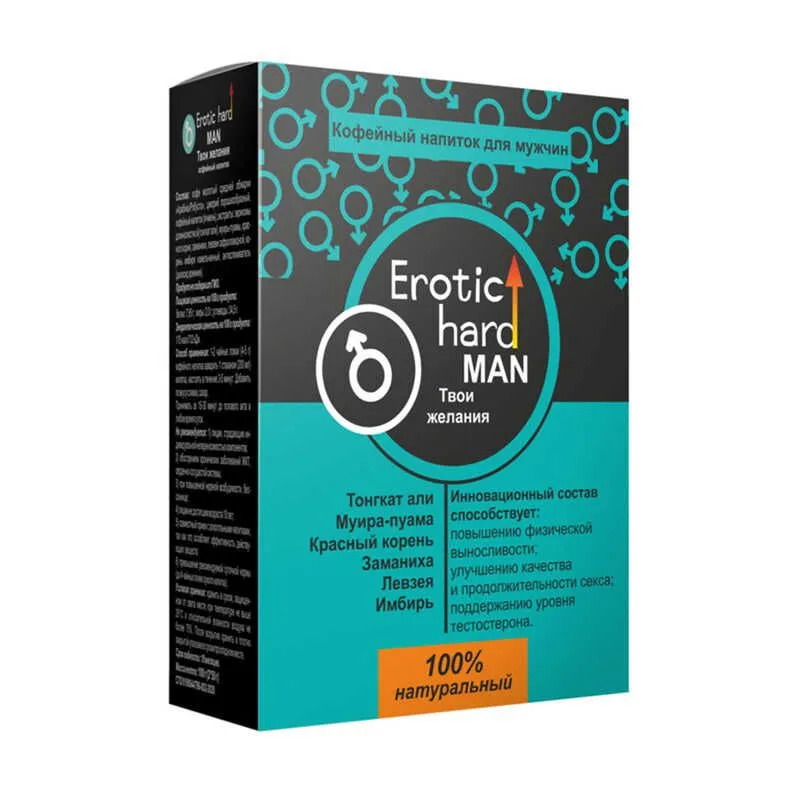 100% натуральный кофейный напиток "Erotic hard MAN" взбодрит вас в любое время дня и ночи! Рекомендуется принимать мужчинам для возбуждения, повышения либидо, увеличения продолжительности секса, улучшение его качества, поддержания уровня тестостерона. Снимает напряжение и усталось, что позволяет усилить желание, снять скованность и получить более яркие эмоции от близости.