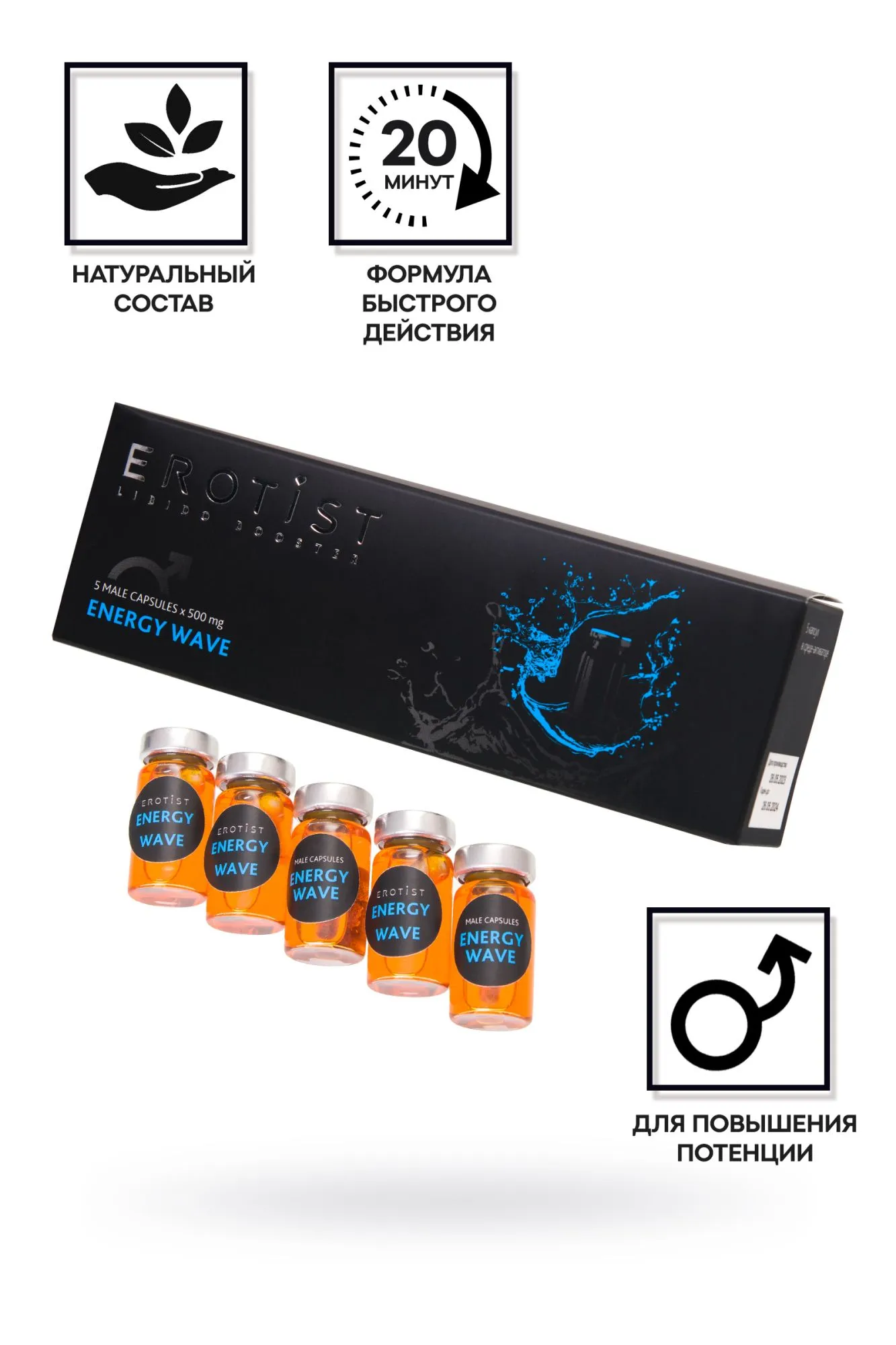 —Капсулы в среде-активаторе Erotist ENERGY WAVE, для мужчин, для усиления эрекции, 5 капсул