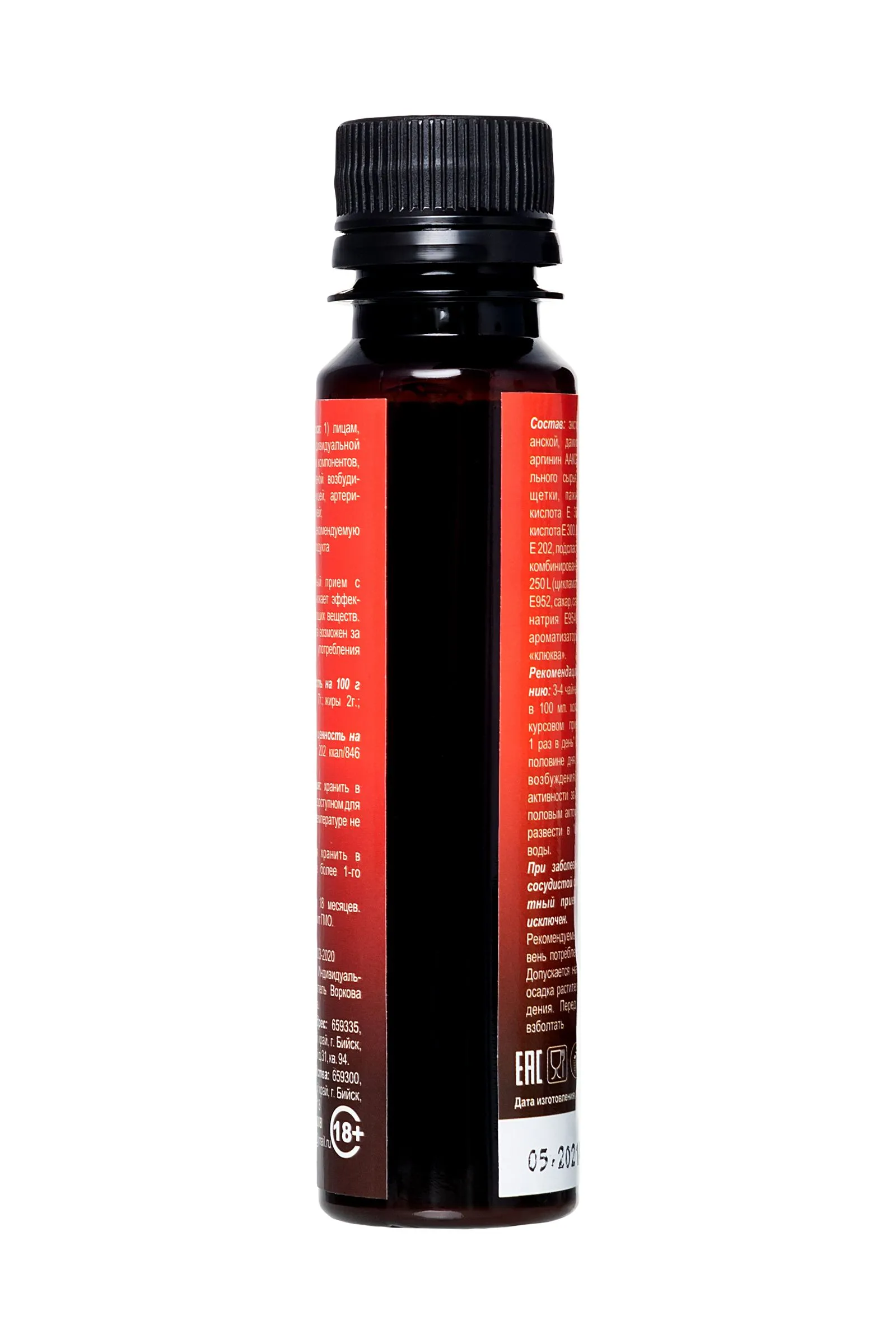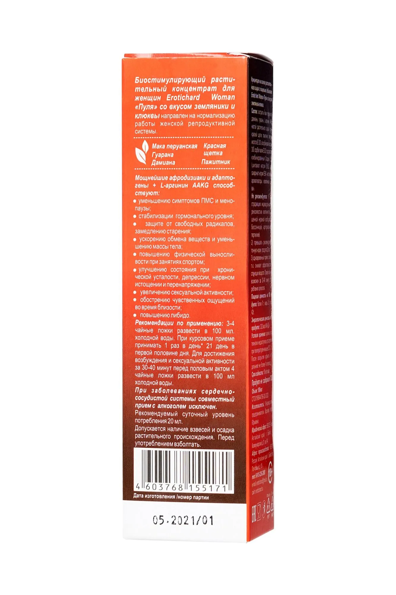 В любом возрасте женщины хотят оставаться сексуально активными, здоровыми, молодыми и привлекательными. Биостимулирующий растительный жидкий концентрат Erotic hard Woman “Пуля” со вкусом земляники и клюквы разработан специально для женщин. За счет натуральных растительных компонентов в составе, Erotic hard Woman “Пуля” оказывает положительный эффект на работу всех основных систем организма. А мощные природные афродизиаки благотворно влияют на половую функцию. Концентрат со вкусом земляники и клюквы не содержит сахара, в его составе натуральный подсластитель “Сладин 250L”, при этом содержание калорий всего 1 Ккал на 100 г. Принимать его безопасно для фигуры и полезно для организма, ведь в 20 мл содержится максимально допустимая суточная доза активных компонентов, в отличие от сиропов. Биостимулирующий растительный жидкий концентрат для женщин “Erotic hard” Woman “Пуля” усиливает либидо; стимулирует сексуальное влечение и возбуждение; добавляет чувственность и яркость оргазмам; повышает физическую выносливость; нормализует гормональную систему; уменьшает симптомы ПМС и менопаузы; способствует укреплению иммунитета; оказывает противовоспалительное и противомикробное действие; улучшает самочувствие, успокаивает и расслабляет нервную систему. Рекомендации по применению: Курсом — принимать внутрь в первой половине дня 4 ч.л. (20 мл), курс приема - 21 день; Единоразово для достижения возбуждения и сексуальной активности перед половым актом — 4 ч.л. (20 мл.) за 30-40 минут до полового акта. Состав: экстракты маки перуанской, дамианы, гуараны, L-аргинин ААКG, настой растительного сырья: корень красной щетки, пажитник, лимонная кислота Е 330, аскорбиновая кислота Е 300, сорбат калия Е 202, подсластитель комбинированный Сладин 250 L (цикламат натрия Е952, сахар, сахаринат натрия Е954, неотам Е 961), ароматизаторы: “земляника”, “клюква”. Противопоказания: Не рекомендуется: лицам, страдающим индивидуальной непереносимостью компонентов, повышенной нервной возбудимостью, бессонницей, артериальной гипертензией; превышать рекомендуемую суточную норму продукта (20 мл.); одновременный прием с алкоголем, т.к. снижает эффективность действующих веществ. Прием концентрата возможен за 30-40 минут до употребления алкоголя. При заболеваниях сердечно-сосудистой системы совместный прием с алкоголем исключен. Объем: 100мл Принимайте Биостимулирующий растительный жидкий концентрат Erotic hard Woman “Пуля” со вкусом земляники и клюквы, а также с другими вкусами, и будьте здоровы.