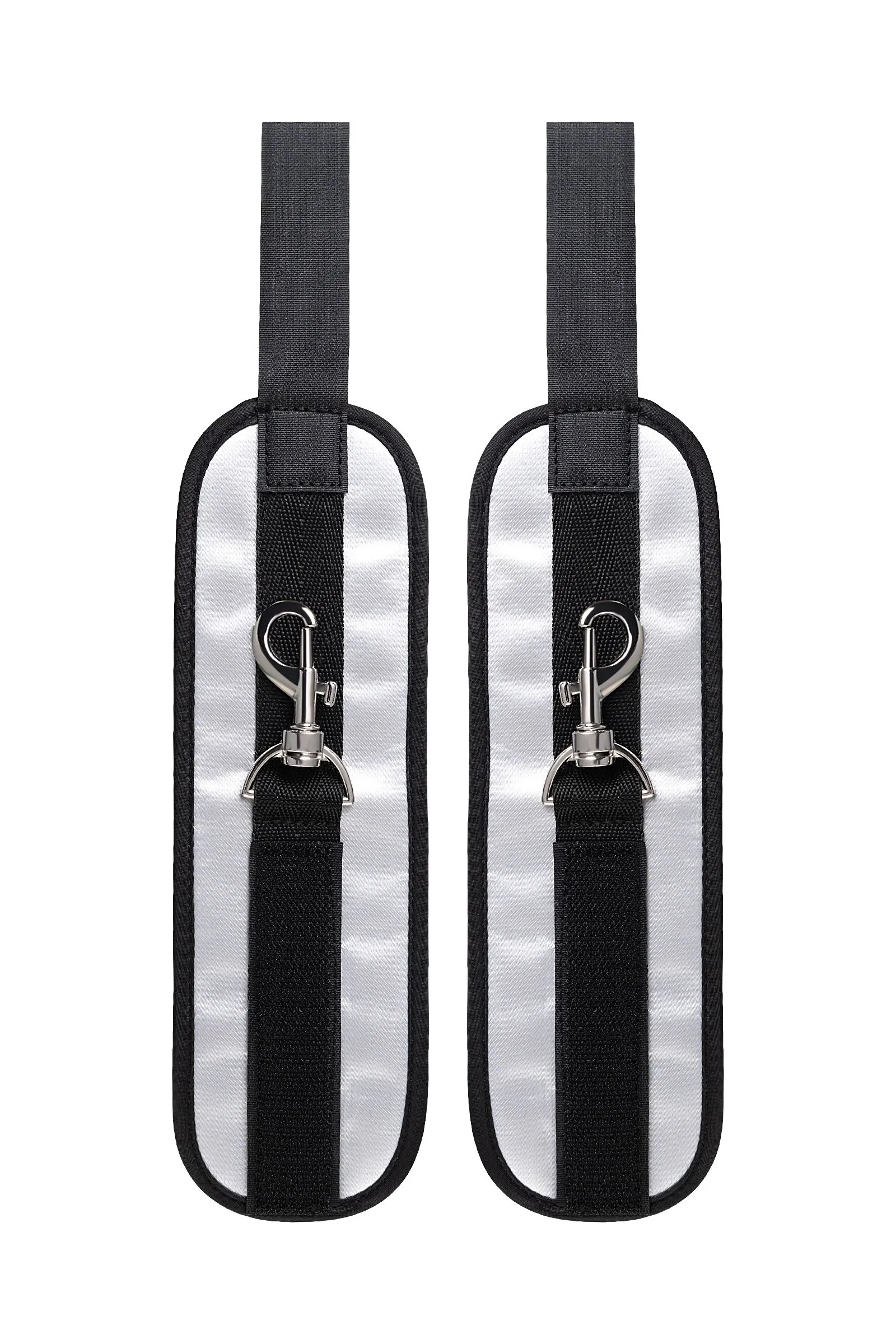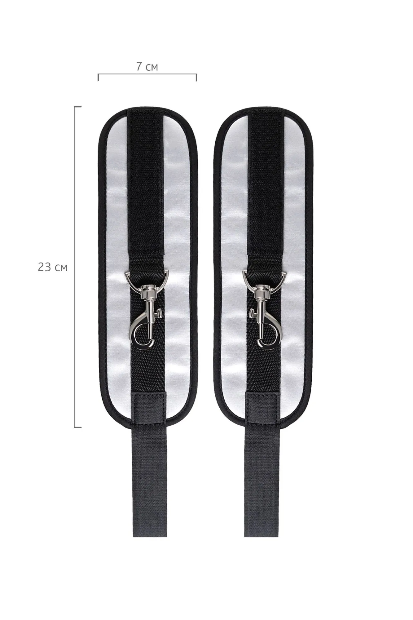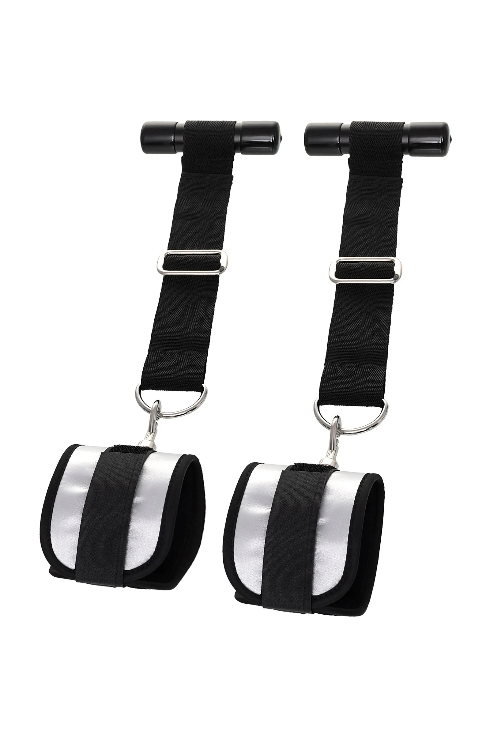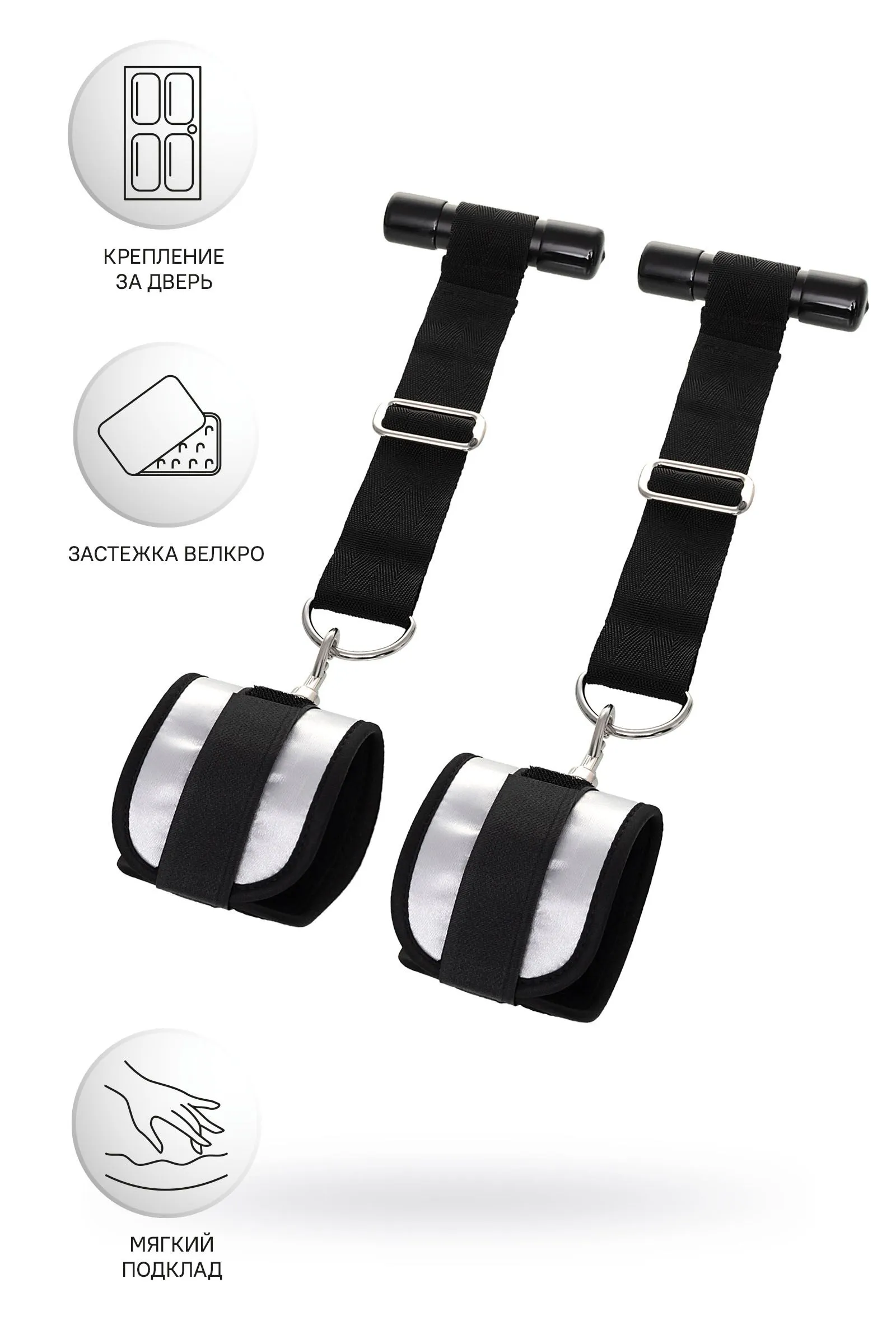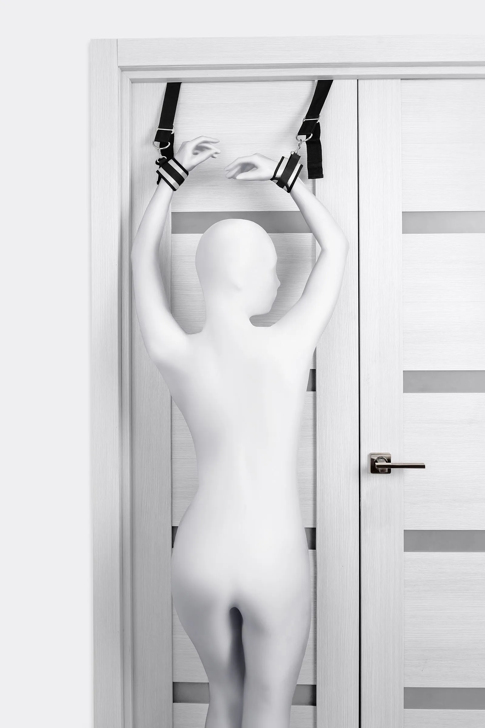 Оставьте наручники и кровать в прошлом веке, пора играть по-взрослому. Фиксаторы для рук на дверь для смелых и терпеливых. Больше позиций для получения удовольствия без силовых затрат! Пластиковые цилиндры фиксируются за дверью, наручники крепятся на запястьях с помощью застежки велкро. Размер легко регулируется ремешками и подойдет для запястий любого размера. Серебряный цвет с черными ремешками смотрится элегантно. Внутренняя часть наручников мягкая и не доставляет дискомфорта во время использования. Фиксаторы с помощью двери дают вам больше свободы для реализации фантазий. Не нужно напрягаться, чтобы удерживать руки вверху, не нужно контролировать своего партнера, если хочется удержать его стоя. Эта оригинальная форма бандажа выведет вас на новый уровень наслаждения с доверием. Материал: полиэстер, полипропилен, ABS-пластик Общая длина наручников: 23 см Длина ремней: 26 см Ширина наручников: 7 см Диаметр цилиндра: 2,5 см