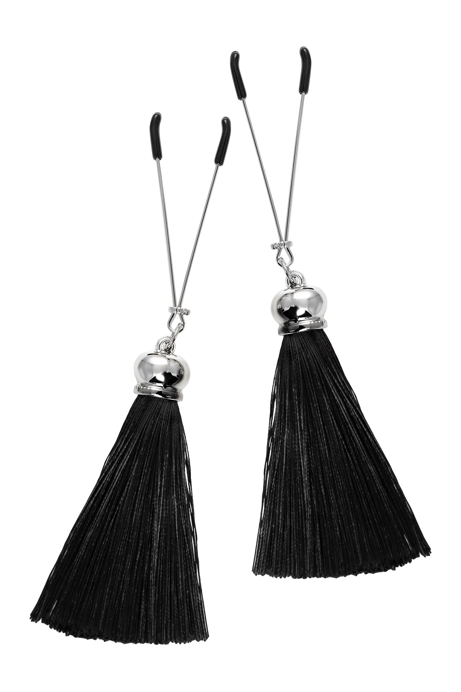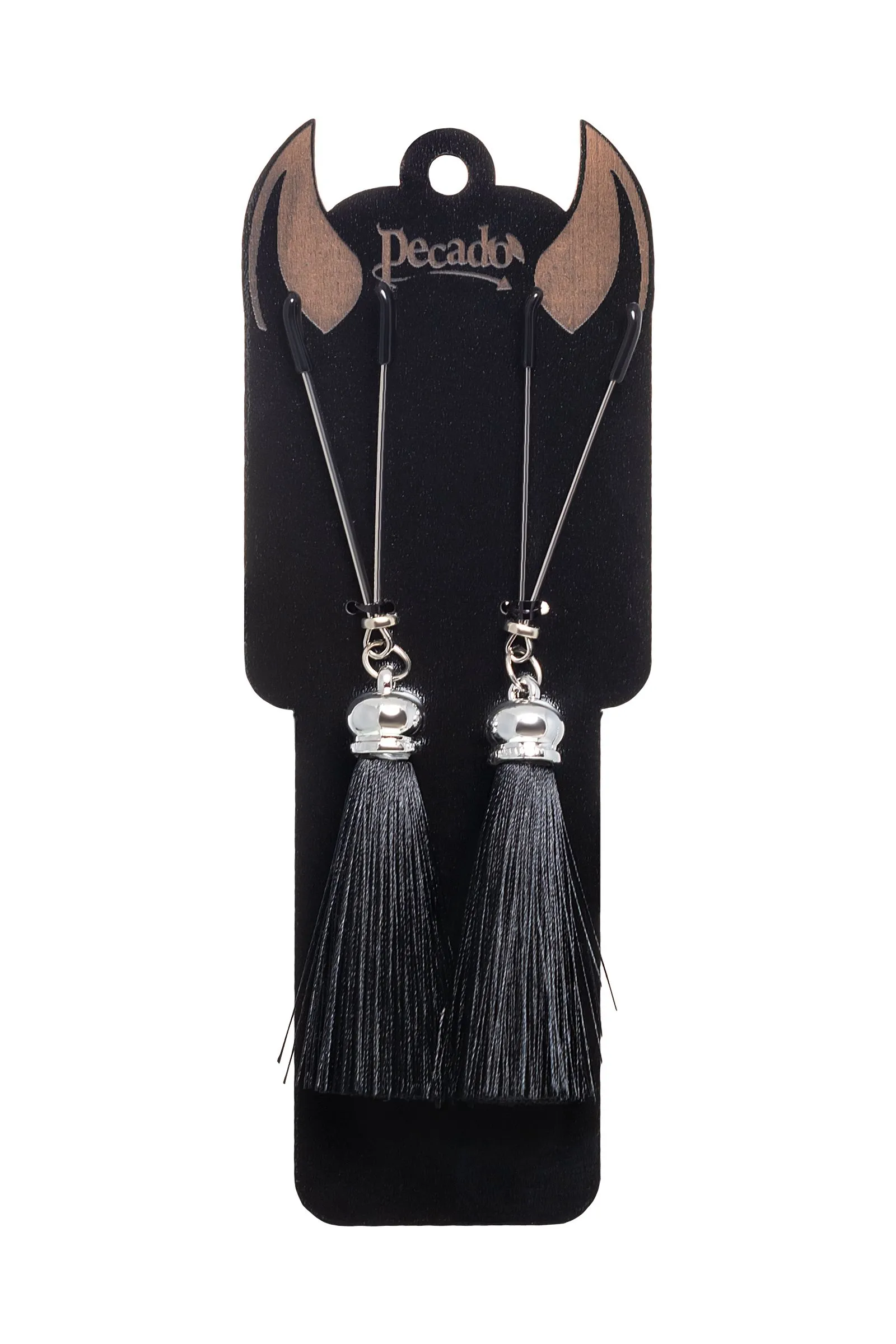 Попробуйте новые, дерзкие ощущения глубокого наслаждения! Зажимы-вилки от Pecado гарантируют смешение ярких чувств от тактильного контакта с нежной кожей сосков. Зажимы выполнены из высококачественных материалов. Металлическая часть компактная, приятная на ощупь. На концах черные резиновые наконечники, для безопасного воздействия на эрогенные зоны. Интенсивность сжатия аксессуара регулируется миниатюрными колечками. В зависимости от личных предпочтений и сценария игры, можно выбрать легкое пощипывание, или сильное сдавливание. Бахрома из натурального шелка, в черном цвете, добавляет манящую красоту смелому атрибуту. При каждом соблазнительном покачивании груди, кисточки движутся в пикантном ритме. Также подходит для стимуляции и возбуждении в области половых губ и клитора. ● Ручная работа. ● Надежная высококачественная фурнитура. ● Не требуют специального ухода.