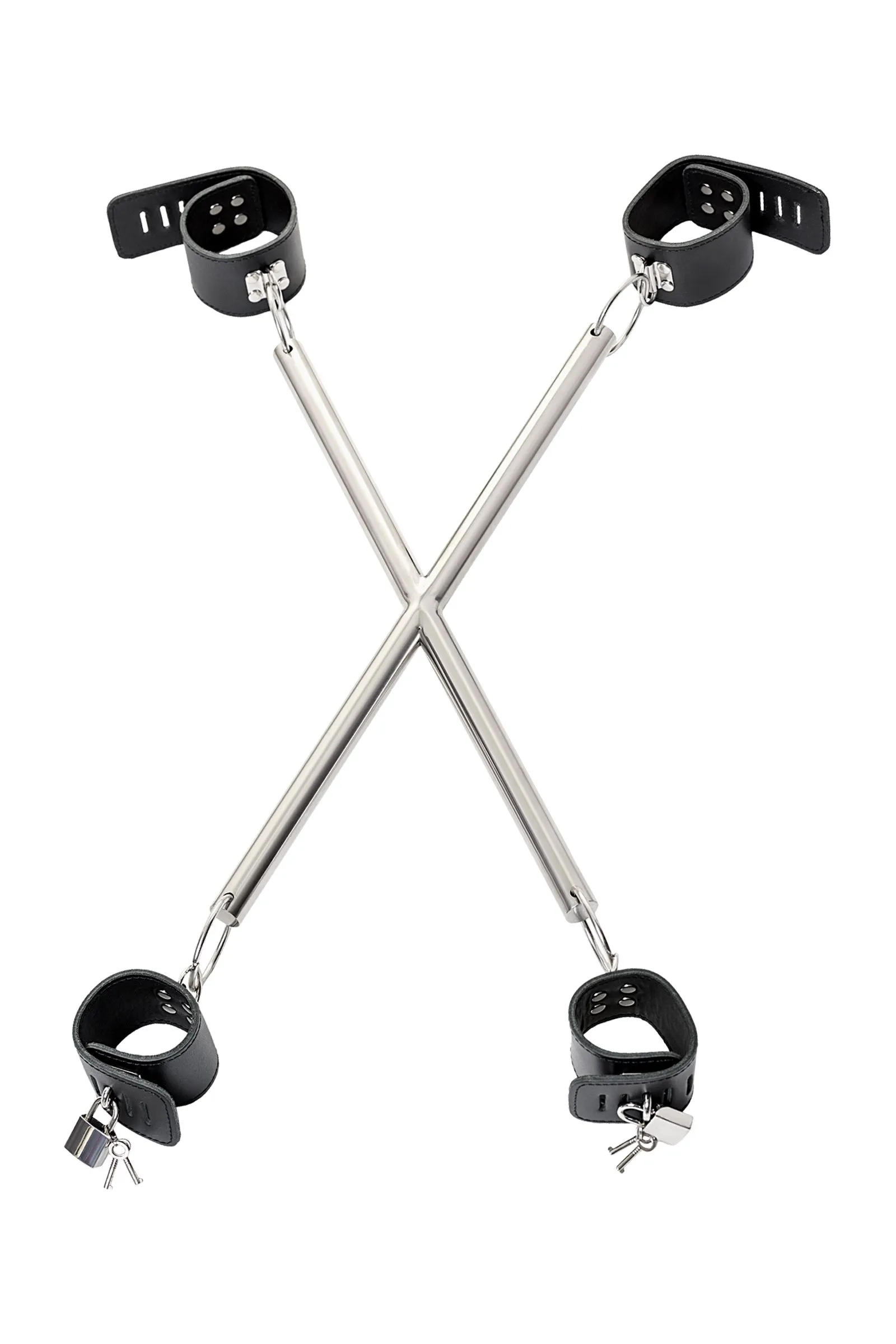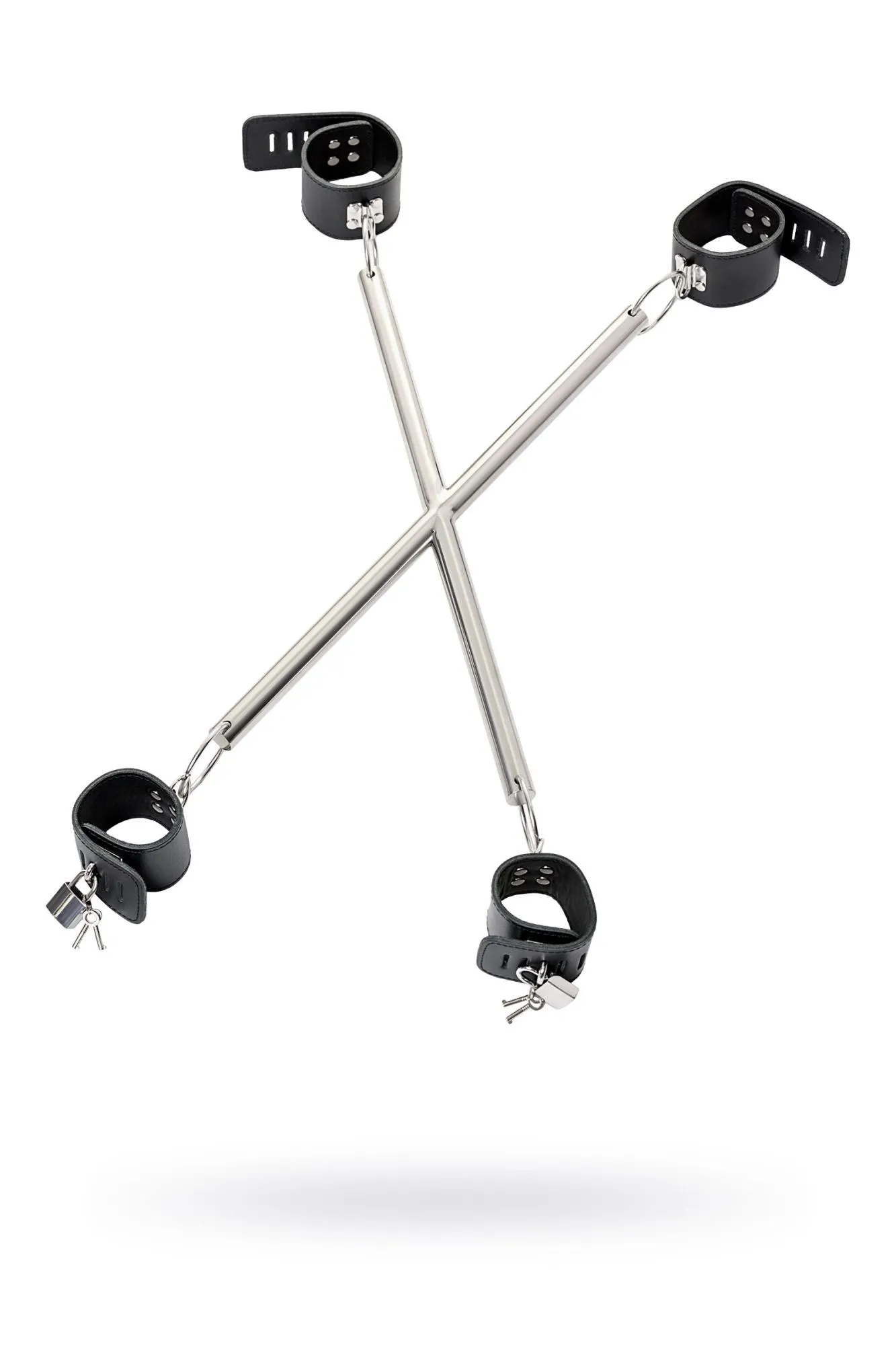 Эта сцепка — идеальный жёсткий бондаж. Браслеты изготовлены из кожи: они мягкие и не травмируют запястья и лодыжки. Металлические перекладины не позволяют делать лишних движений, так как руки и ноги фиксируются близко к перекладинам. Такой аксессуар придётся по душе каждому, кто затеял игры с ограничением движения.