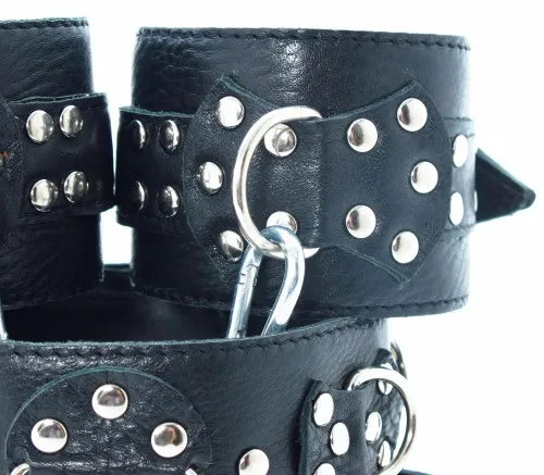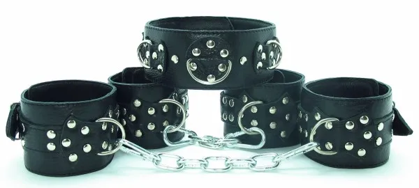 Набор аксессуаров, изготовленных из натуральной кожи. В него входят: наручи и поножи, украшенные заклепками (ширина - 6 см), которе можно соединять и комбинировать между собой при попощи цепей с карабтинами (входят в комплект) Размер меняется при помощи застежки. Так же имеется черный ошейник, шириной 4,5 см, с одним кольцом. Размер регулируется застежками на кнопках.