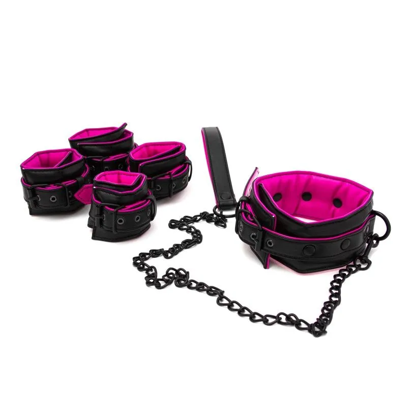 В бондажный набор входят ошейник с поводком, наручники и поножи. Каждый элемент выполнен из искуственной кожи чёрного и рзового цвета, размеры регулируются ремешками с пряжкой. В отделке использована фурнитура из металла и пластика. Такой набор отлично подходит для любовных игр в стиле БДСМ!