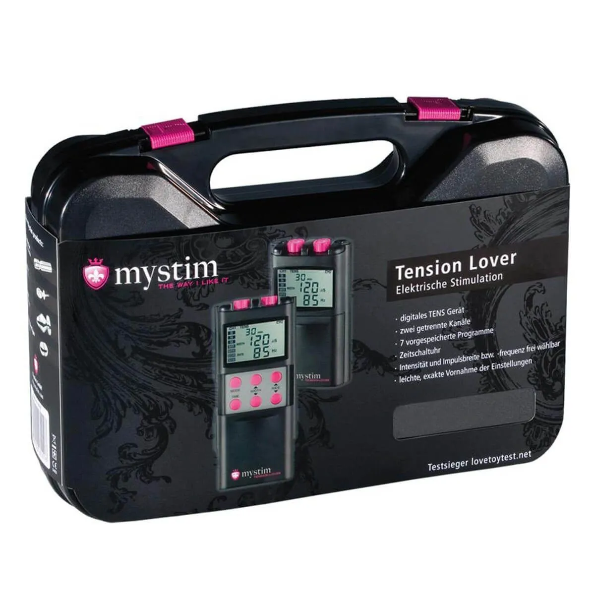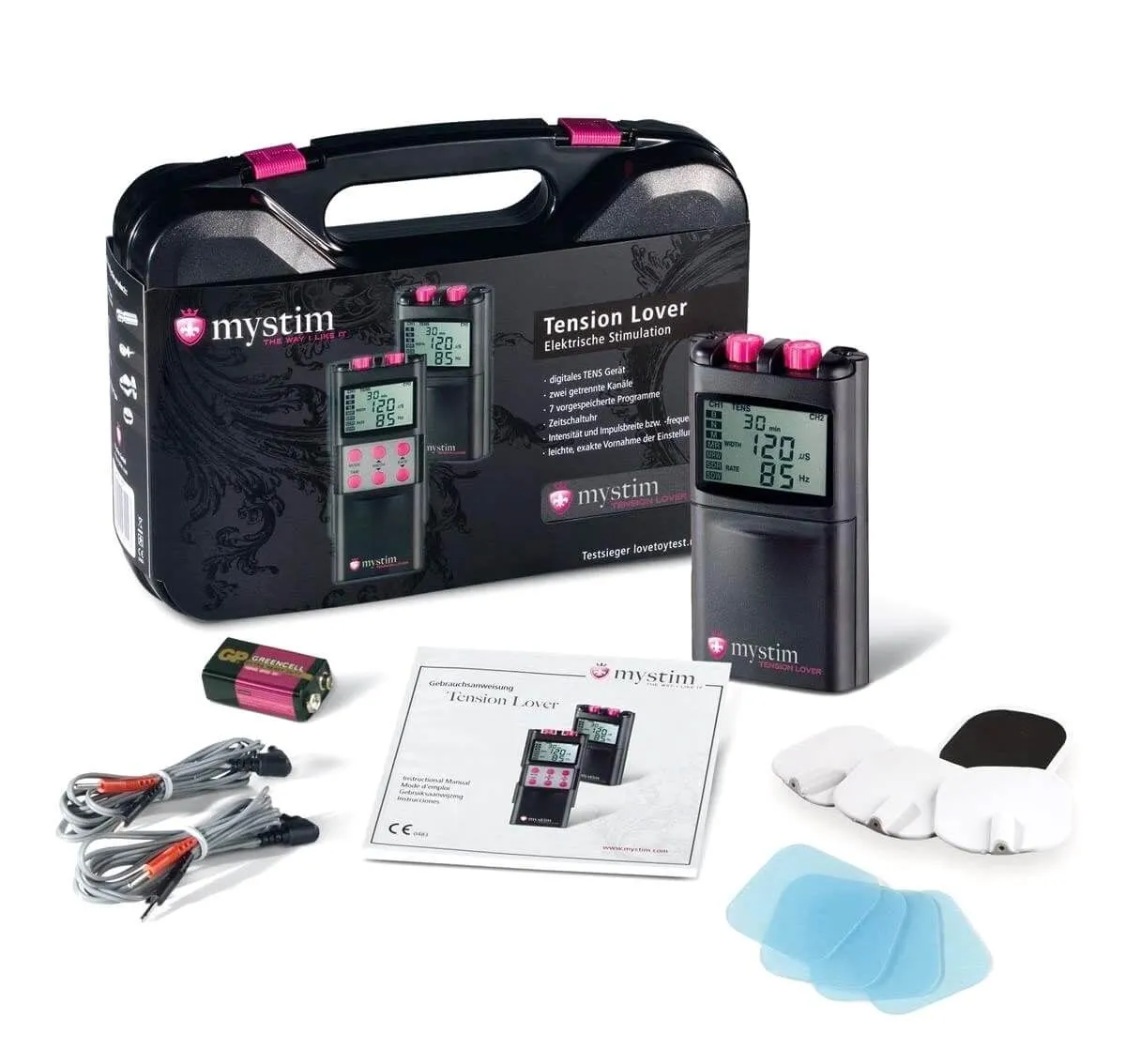 Tension Lover оснащен жидкокристаллическим дисплеем, таймером и возможностью блокировки кнопок. В комплекте с устройством идут 2 электродных кабеля, батарея и 4 накладки с электродами.