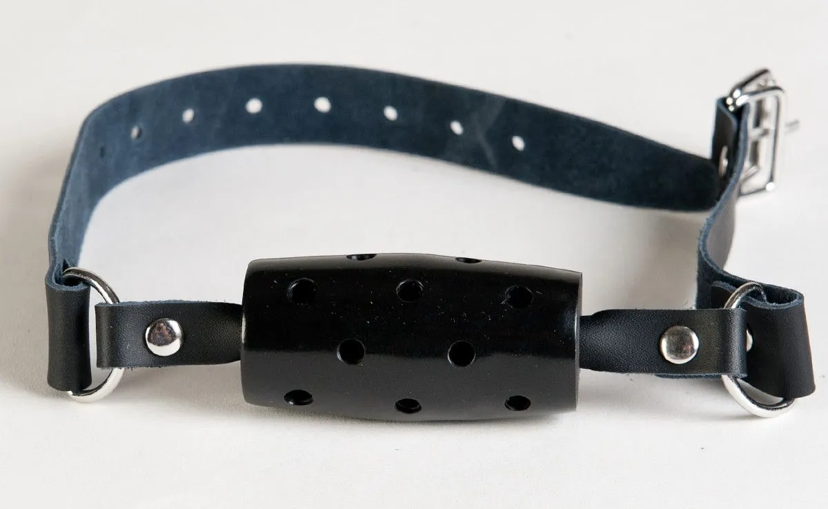 Кляп цилиндрической формы. Материал ПВХ обеспечивает необходимую жесткость, кожаный ремешок - фиксацию на голове.