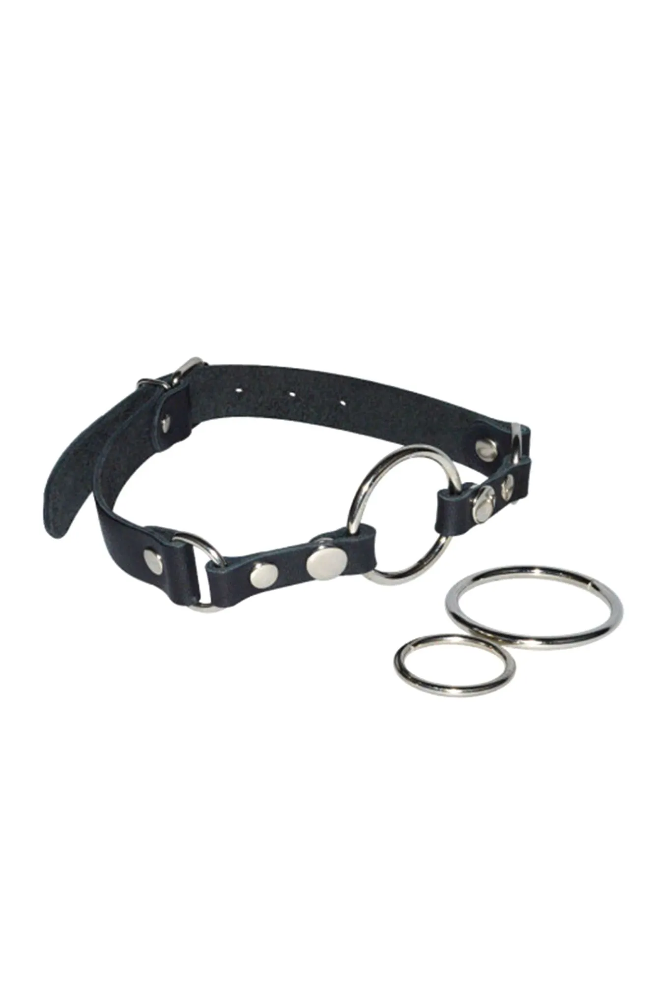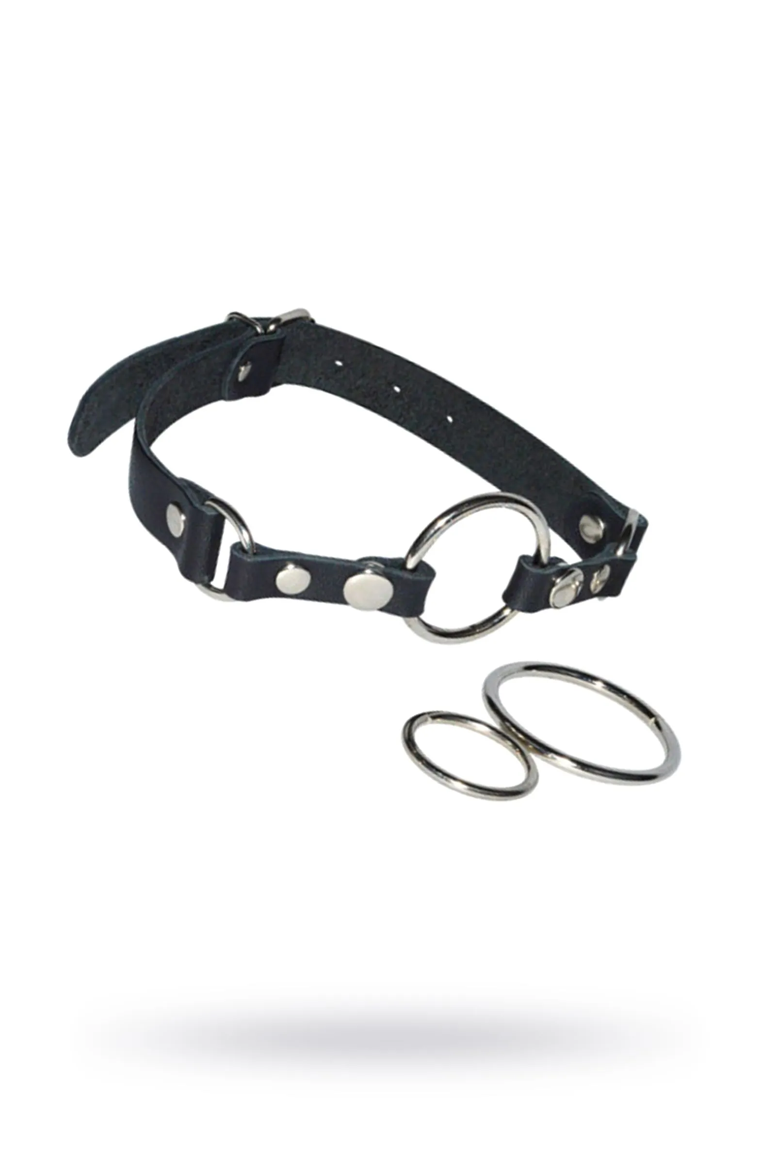 Кляп-рамка изготовлен из натуральной высококачественной кожи чёрного цвета. Особенностью данного девайса, являются сменные кольца, которые легко отстегнуть при помощи кнопок. Внешний диаметр колец: 38 мм, 44 мм, 59 мм. Зафиксировать и отрегулировать изделие можно при помощи металлической пряжки. Вся металлическая фурнитура имеет никелевое покрытие.