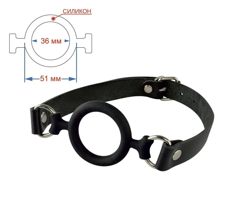 Силиконовый кляп-рамка с ремешками из натуральной кожи. Регулируется кляп при помощи металлической пряжки. Металлическая фурнитура имеет никелевое покрытие. Общая длина 59 см. Внешний диаметр 51 мм, внутренний 36 мм. Ширина ремешков 20 мм.