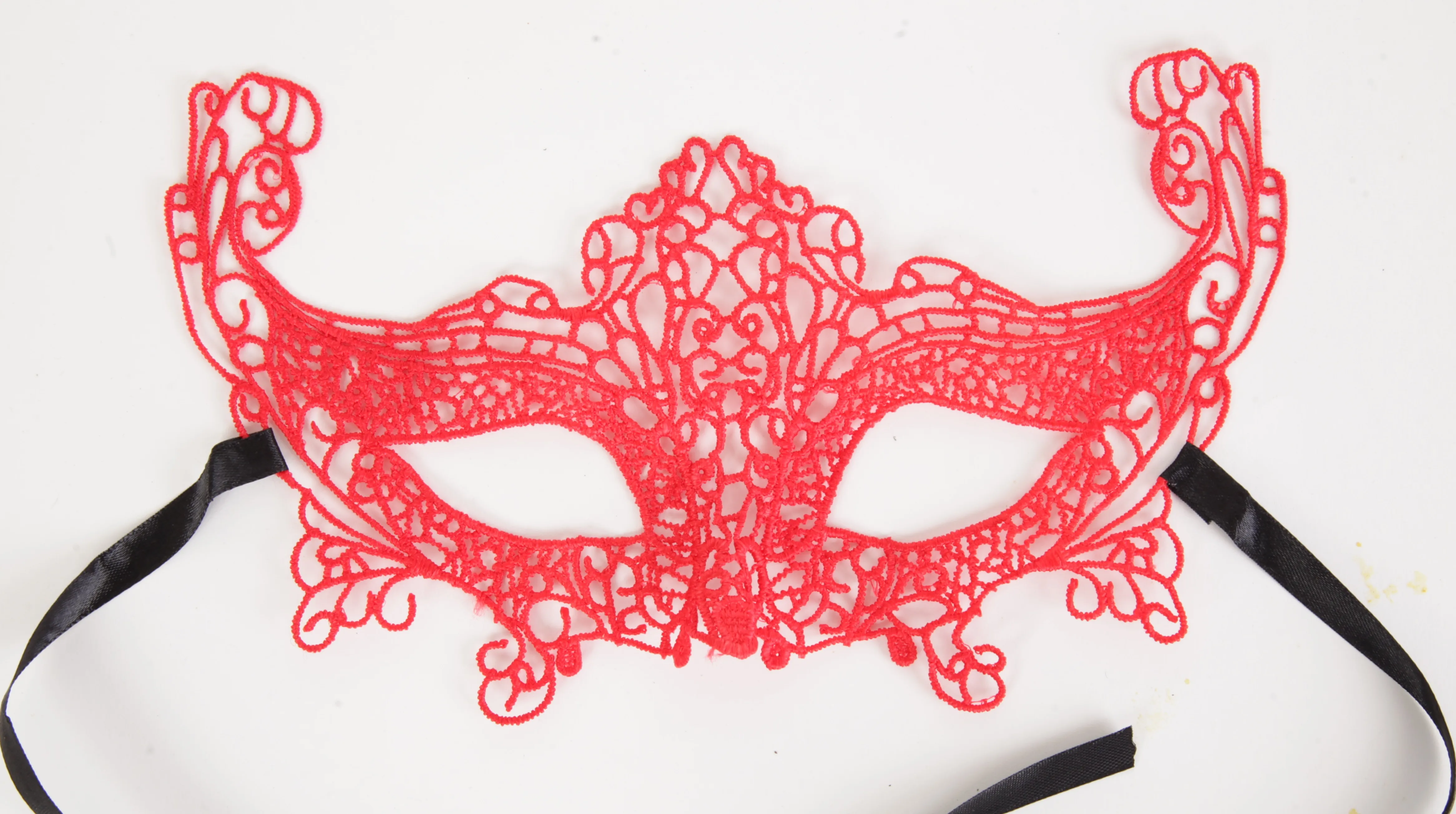 Красная кружевная маска в венецианском стиле с многочисленными узорами. Завязывается на черные атласные ленты. Размеры маски: длина- 23,5 см, ширина - 14 см. Упаковка- картонный конверт.