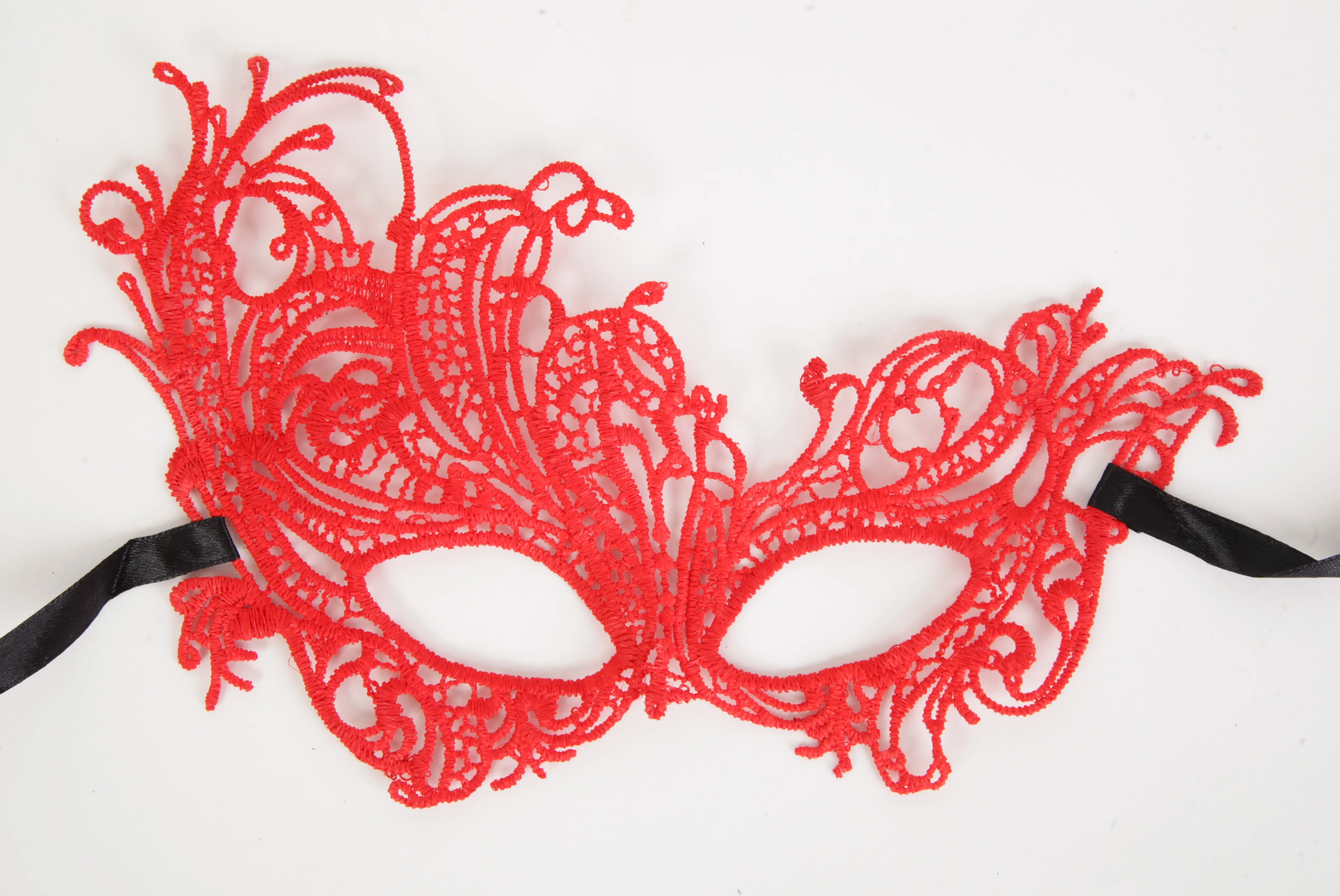Красная кружевная маска в венецианском стиле с многочисленными узорами. Завязывается на черные атласные ленты. Размеры маски: длина- 24 см, ширина - 15 см. Упаковка- картонный конверт.