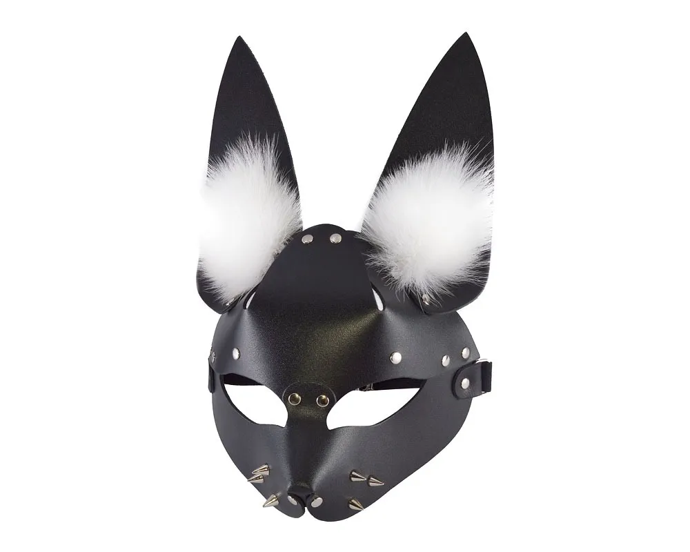 Маска изготовлена из натуральной кожи черного цвета и декорирована металлическими шипами и натуральным мехом. Размер маски можно подогнать при помощи регулятора. Размер универсальный.