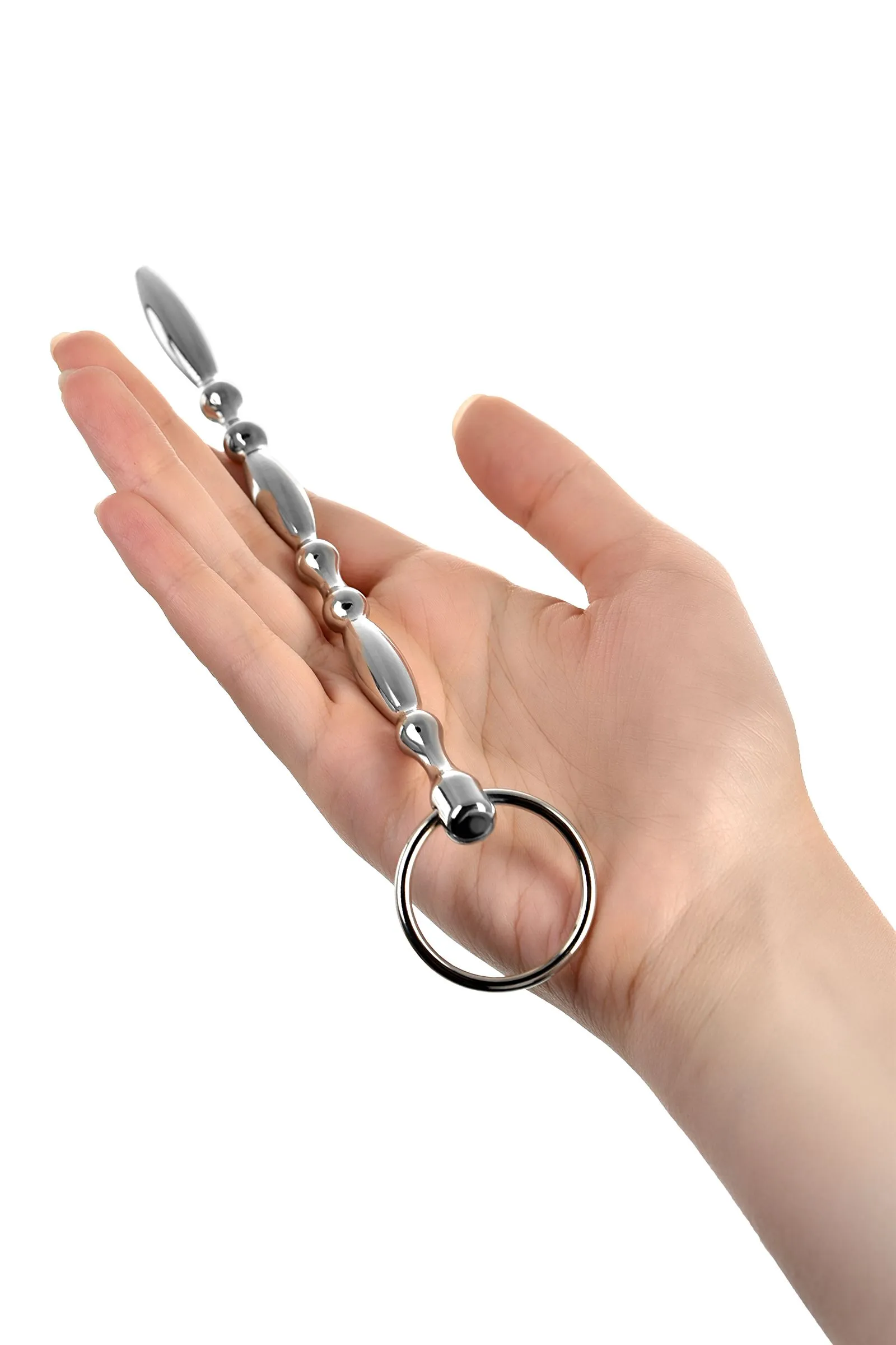 Металлический уретральный плаг с кольцом в основании. Фигурная форма дает дополнительную стимуляцию уретры. Общая длина плага - 18 см, рабочая - 16 см.
