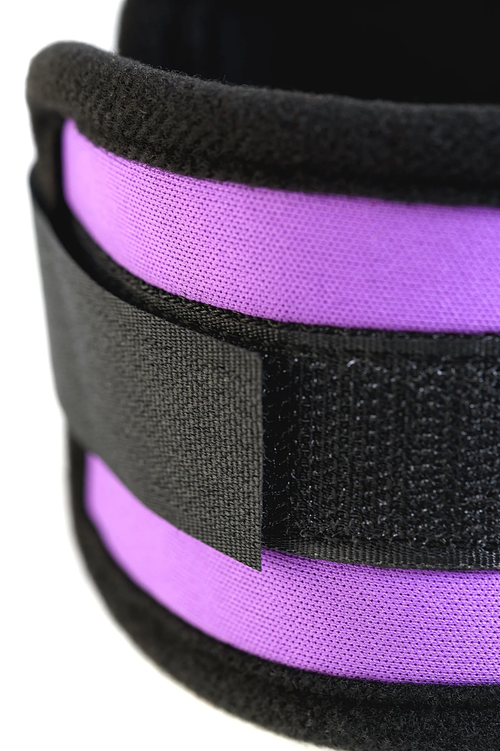 Наручники фиолетовые неопреновые. Мягкие манжеты с застежкой велкро, позволяющей максимально регулировать объем. Между собой наручники соединены карабинами.