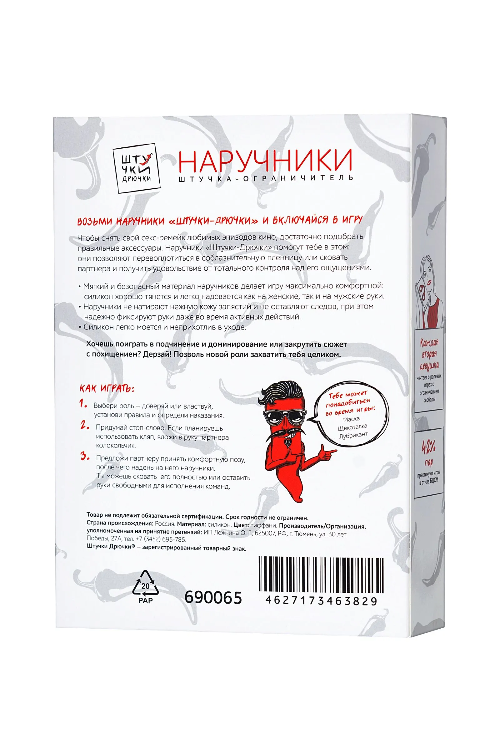Возьми наручники «Штучки-Дрючки» и включайся в игру. Чтобы снять свой секс-ремейк любимых эпизодов кино, достаточно подобрать правильные аксессуары. Наручники «Штучки-Дрючки» помогут тебе в этом: они позволяют перевоплотиться в соблазнительную пленницу или сковать партнера и получить удовольствие от тотального контроля над его ощущениями. Мягкий и безопасный материал наручников делает игру максимально комфортной: силикон хорошо тянется и легко надевается как на женские, так и на мужские руки. Наручники не натирают нежную кожу запястий и не оставляют следов, при этом надежно фиксируют руки даже во время активных действий. Силикон легко моется и неприхотлив в уходе. Хочешь поиграть в подчинение и доминирование или закрутить сюжет с похищением? Дерзай! Позволь новой роли захватить тебя целиком.
