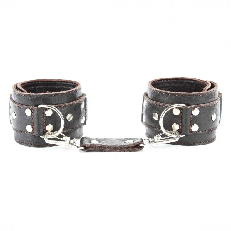 Кожаные наручники потрясающего коричневого цвета.Ширина - 5 см. Украшены заклепками и соединяются между собой цепью с карабинами (длина цепочки - 15,5 см) Размер наручников регулируется при помощи застежки-липучки