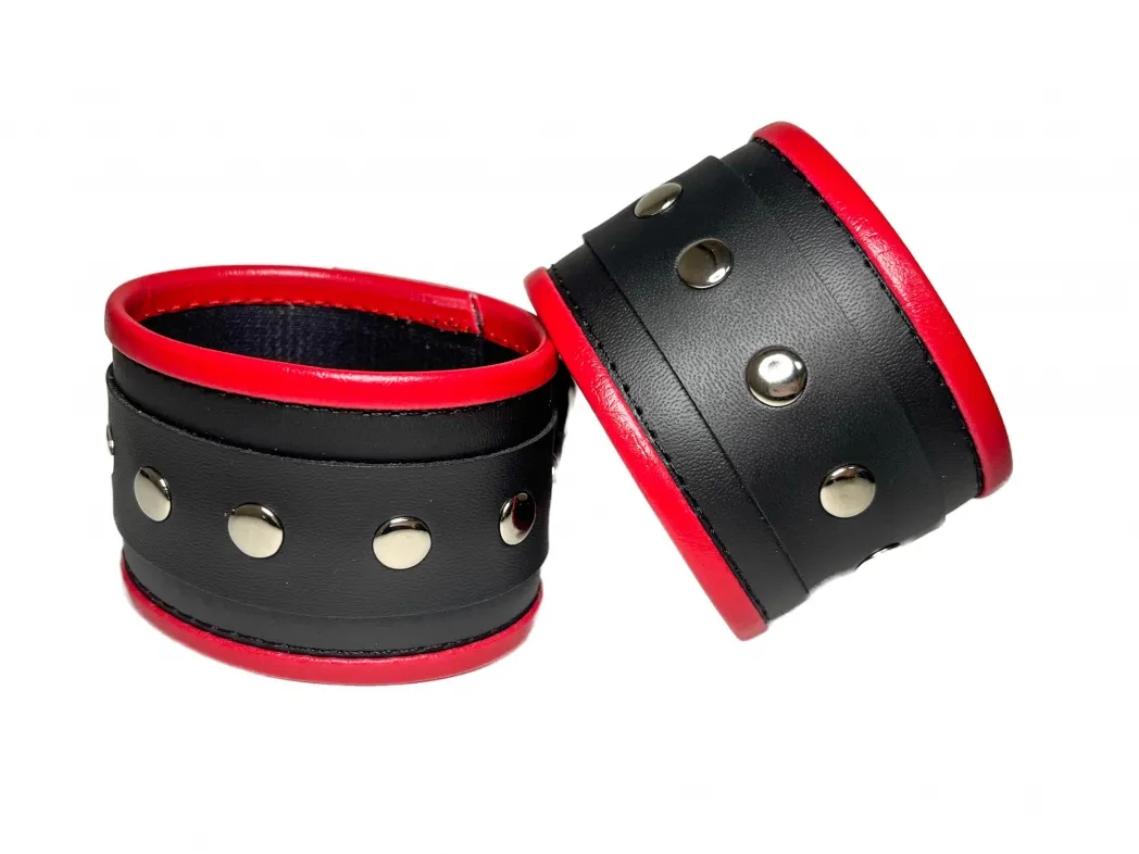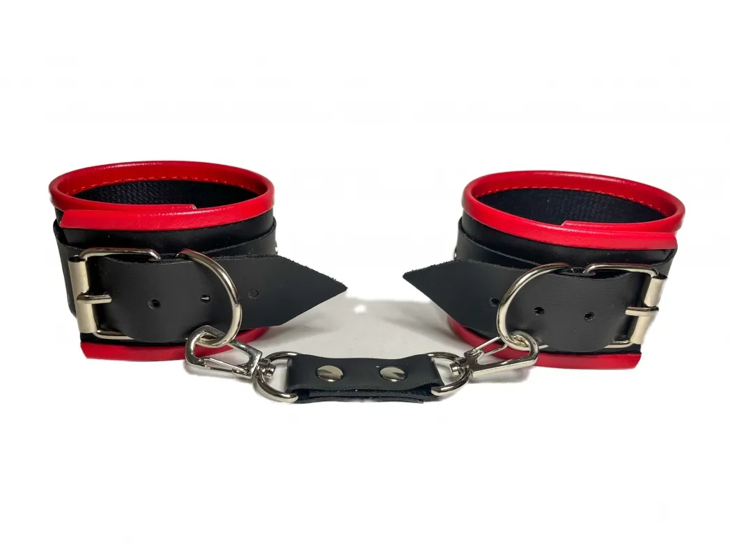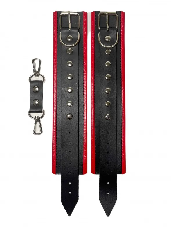 Красивые и функциональные наручники, выполненные из искусственной кожи. Декорированы металлической фурнитурой и красными вставками по краям. Обхват удобно регулируется с помощью пряжек. Ширина наручников 5,5см, общая длина наручника вместе с ремешком 31см. В комплекте идет соединение с карабинами, общая длина соединения 11см. Очень экономичный, экологичный и практически незаменимый аксессуар для вашей любовной игры! Материал: эко-кожа, металл Цвет: черный, красный