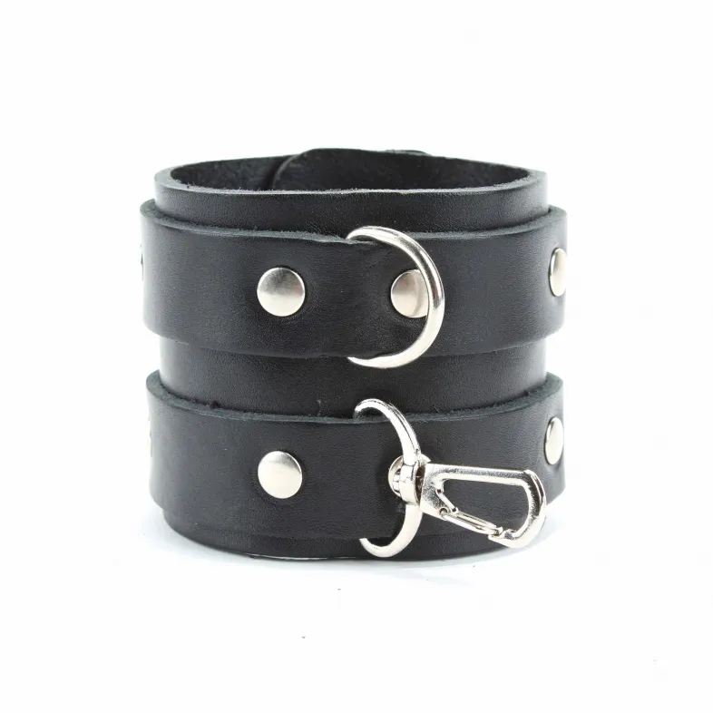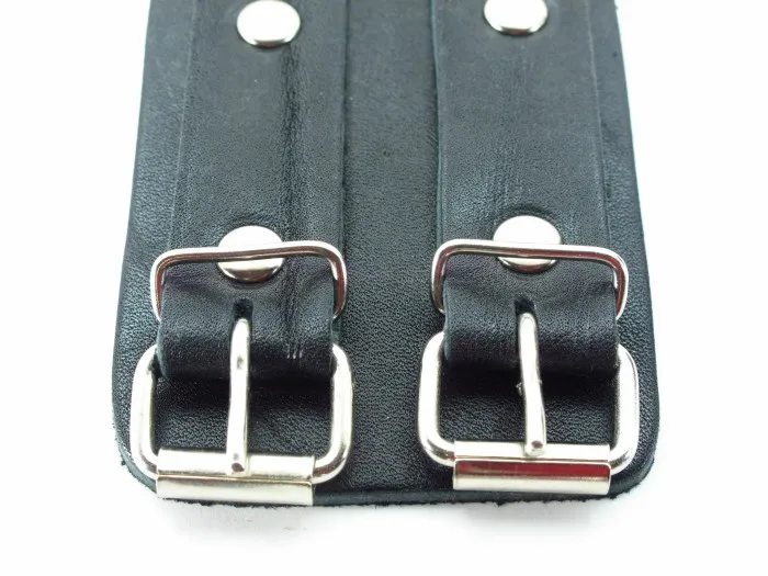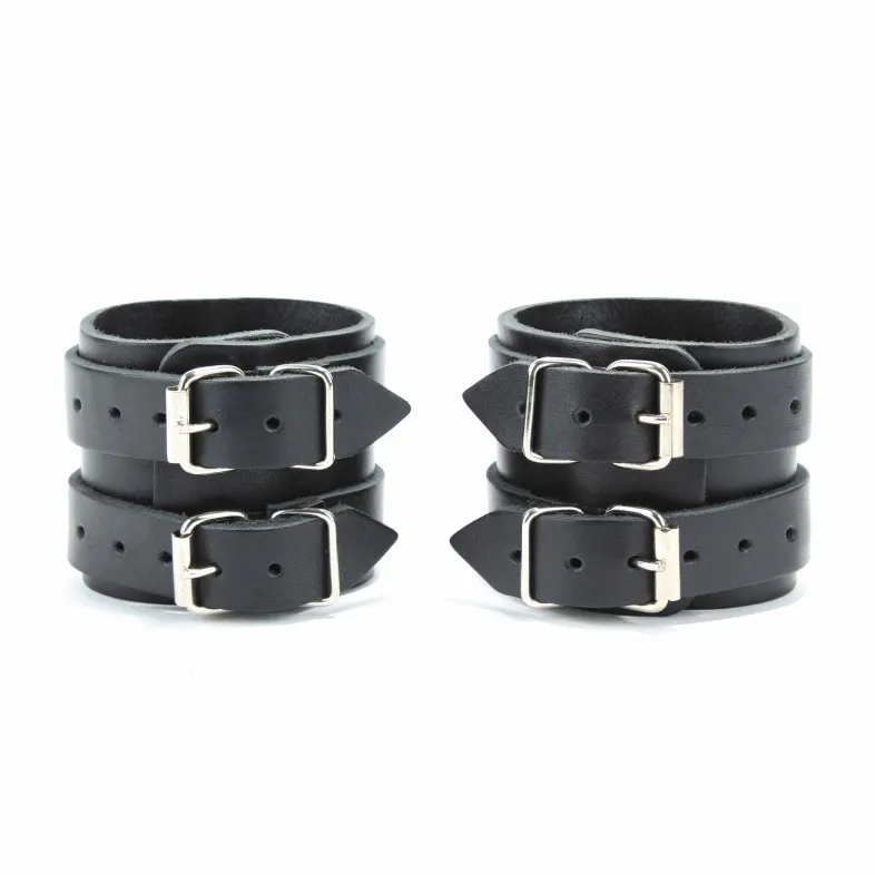 Наручники широкие с двумя ремешками. Изготавливаются из натуральной кожи, металла и полимерных материалов. При изготовлении использована фурнитура с никелевым покрытием. Размер универсальный.
