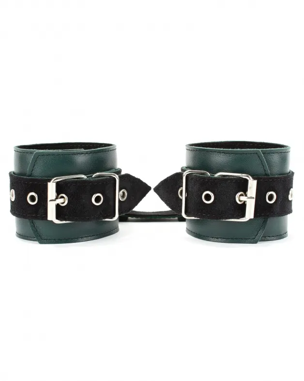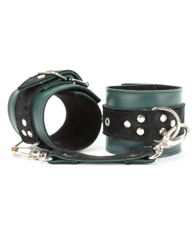 Оковы выполнены из натуральной кожи изумрудного цвета. Изделие декорировано ремнями из замши черного цвета. Посредине аксессуара расположено полукольцо из сварной фурнитуры. Оковы надежно фиксируются пряжками и ремнями, позволяющими выбрать нужный размер, кожаное соединение на карабинах фиксирует оковы вместе. Стильный аксессуар отлично подходят для воплощения эротических БДСМ игр.
