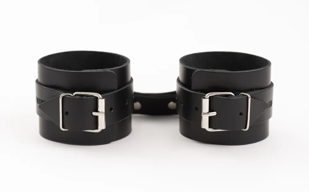 Прочные фиксаторы на ноги, выполнены из натуральной кожи черного цвета. Имеют надежное крепление, благодаря использованию в производстве качественной металлической фурнитуры. Размер универсальный регулируется с помощью ремешков. Оковы имеют лаконичный дизайн. Упакованы в картонную коробку.