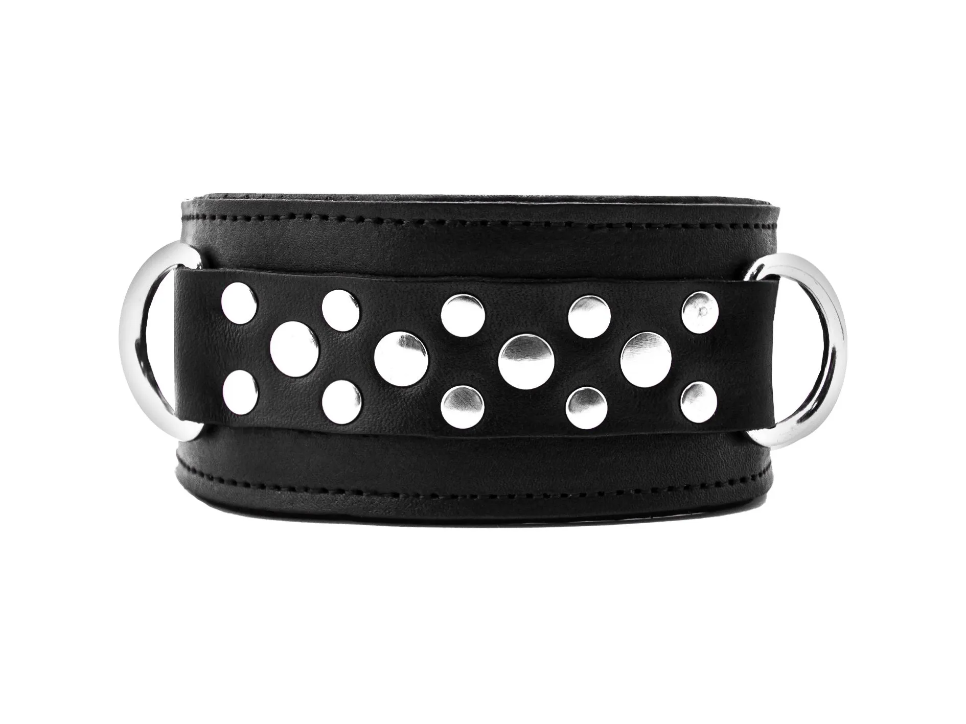 В БСДМ - практике ошейники используются не только в качестве красивого аксессуара, но и для подчинения «нижнего», используется в качестве связующего элемента бондажа. Этот девайс обостряет ощущения и позволяет открыть новые грани чувствительности. Ошейник выполнен из натуральной кожи высокого качества и декорирован геометрическим рисунком из двух видов заклепок. Он оснащен тремя D - кольцами, которые обеспечивают удобство крепления различных бандажных систем (карабины, веревки, ленты). Мягкая подкладка обеспечит максимальный комфорт и безопасность при использовании. Застегивается bdsm ошейник на ремешок с пряжкой. Поводок в комплект не входит