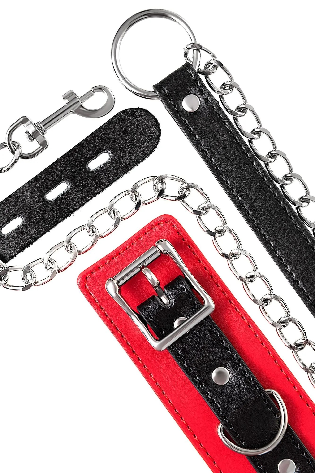 Атрибут для вашего лучшего перфоманса – яркий ошейник. Это не только символ подчинения и доверия, но и изюминка, способная разукрасить вашу интимную жизнь игрой. В этом ошейнике сочетаются элементы, возбуждающие страсть и фантазию: кожа красного и черного цветов и отделка металлическими элементами. Ошейник прекрасно вписывается в любой эротический образ – будь на вас сексуальный комплект белья, или только помада алого цвета. Мягкая кожа нежно облегает шею, а размер легко регулируется надежной металлической пряжкой. Передать власть партнеру легко с помощью поводка длиной 80 см, который крепится к одному из колец. Играйте в доминирование и подчинение в свое удовольствие! Длина ошейника: 43,5 см Ширина ошейника: 5,5 см Длина поводка: 80 см Материал: экокожа