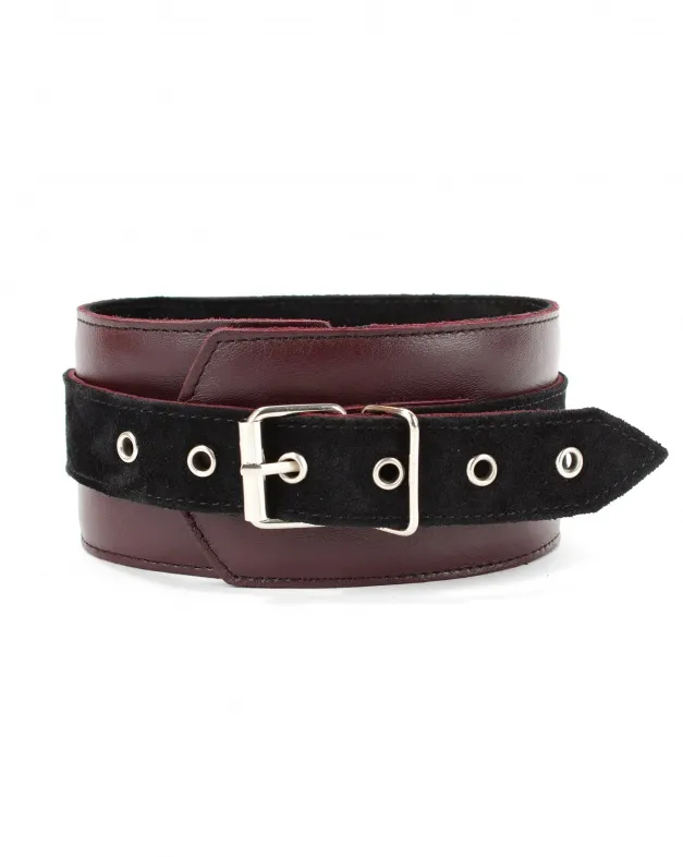 Ошейник выполнен  из натуральной кожи бордового цвета,  декорирован вставкой из черной замши, заклепками, металлическим кольцом  и двумя полукольцами. Сзади аксессуар надежно фиксируется пряжкой,  ремень  позволяет  выбрать нужный размер.  Мягкий подклад  из замши обеспечит комфортное пребывание в аксессуаре.