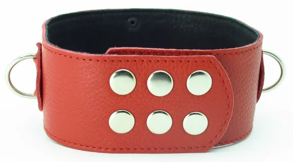 Красный кожаный ошейник с короткими шипами. Имеет три кольца для карабинов, два ряда заклепок-застежек. Ширина ошейника - 5см. Размер регулируется.