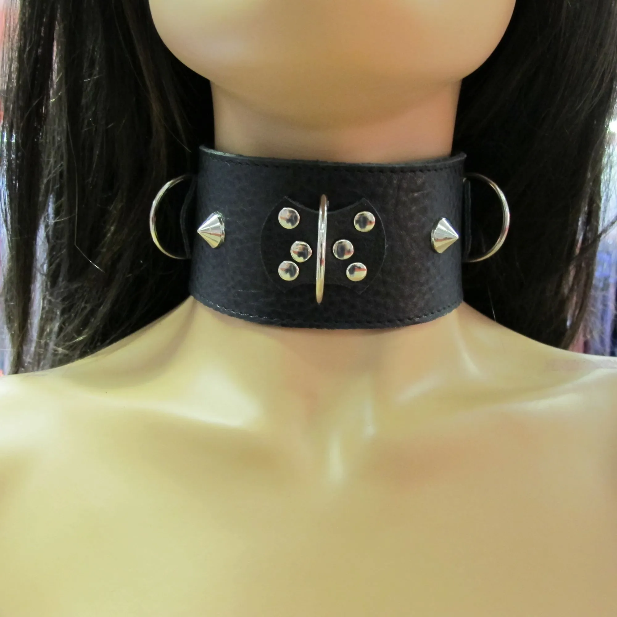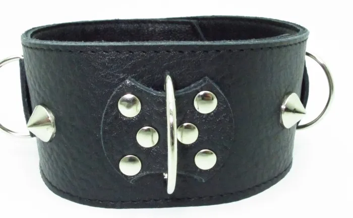 Черный кожаный ошейник с короткими шипами. Имеет три кольца для карабинов, три ряда заклепок-застежек. Ширина ошейника - 5,4см. Размер регулируется.