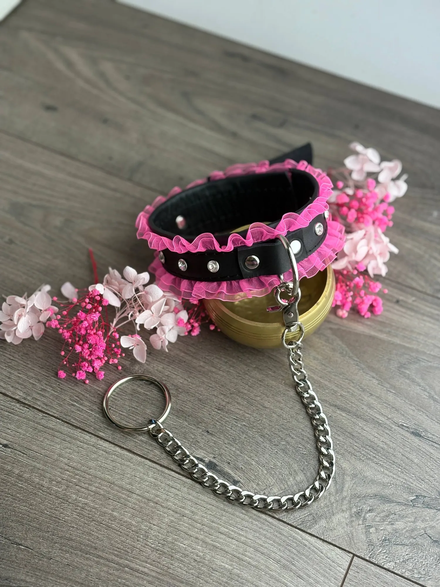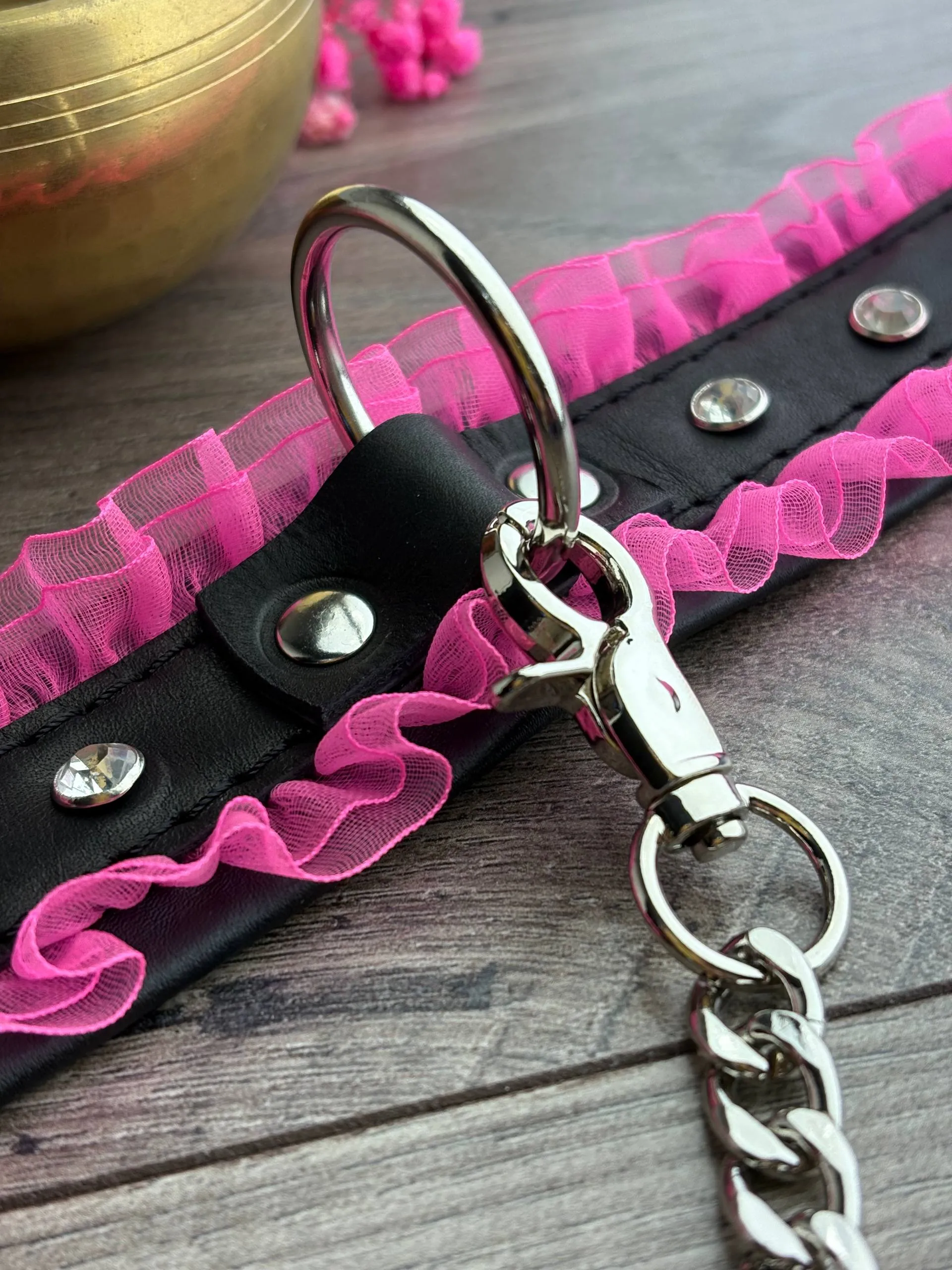 Основа - натуральная кожа, декор - рюши и стразы, поводок-цепь в комплекте