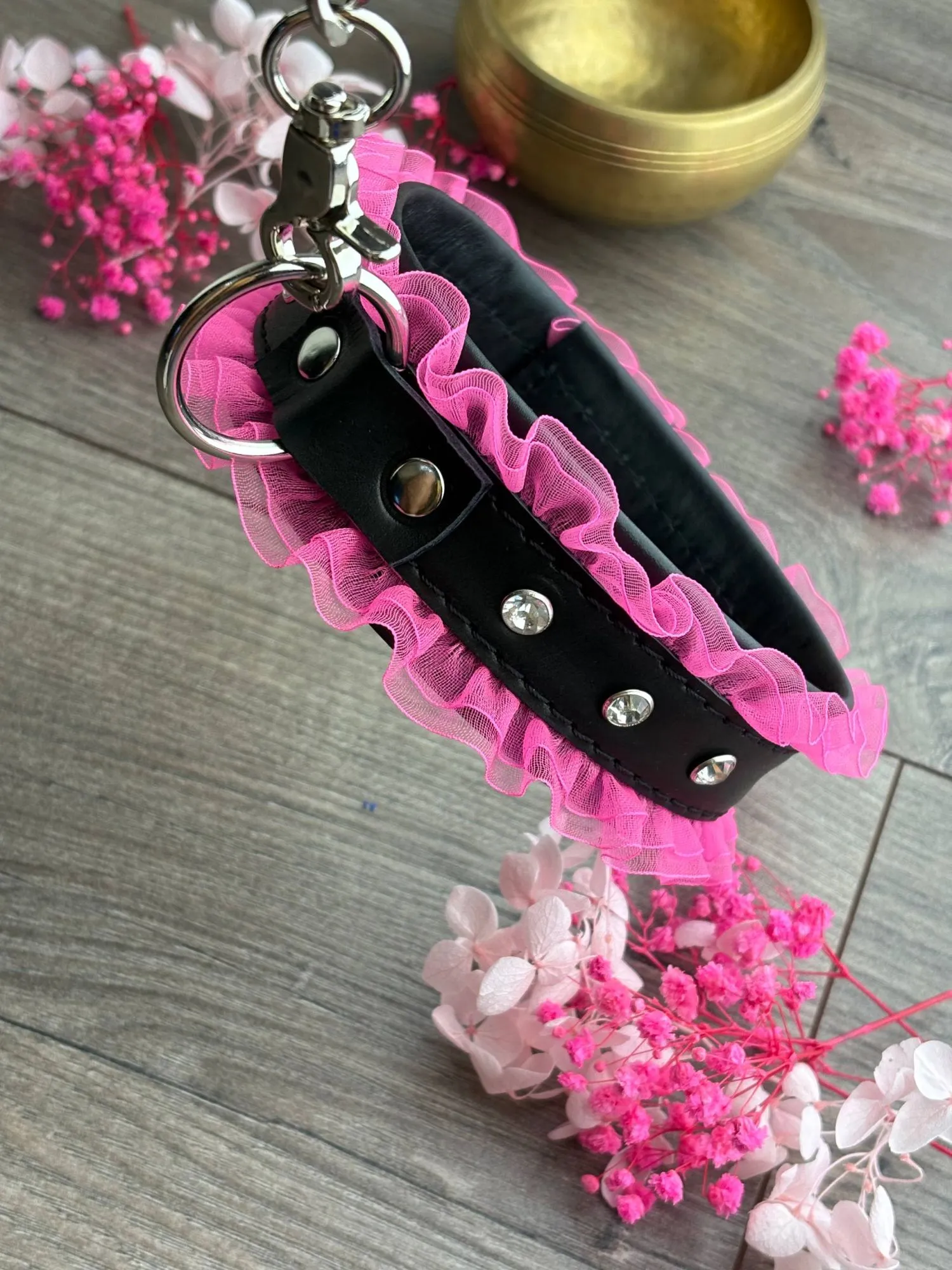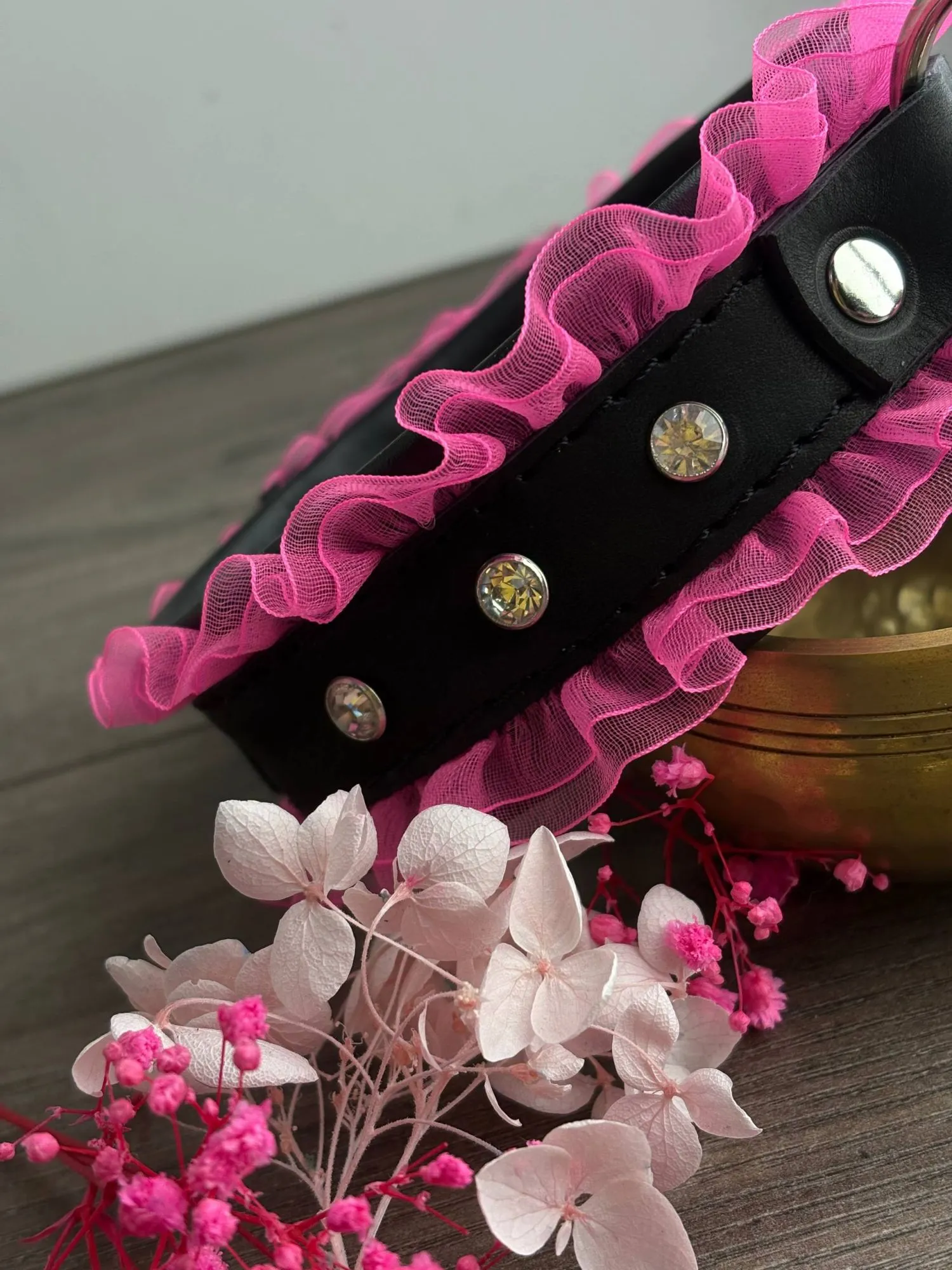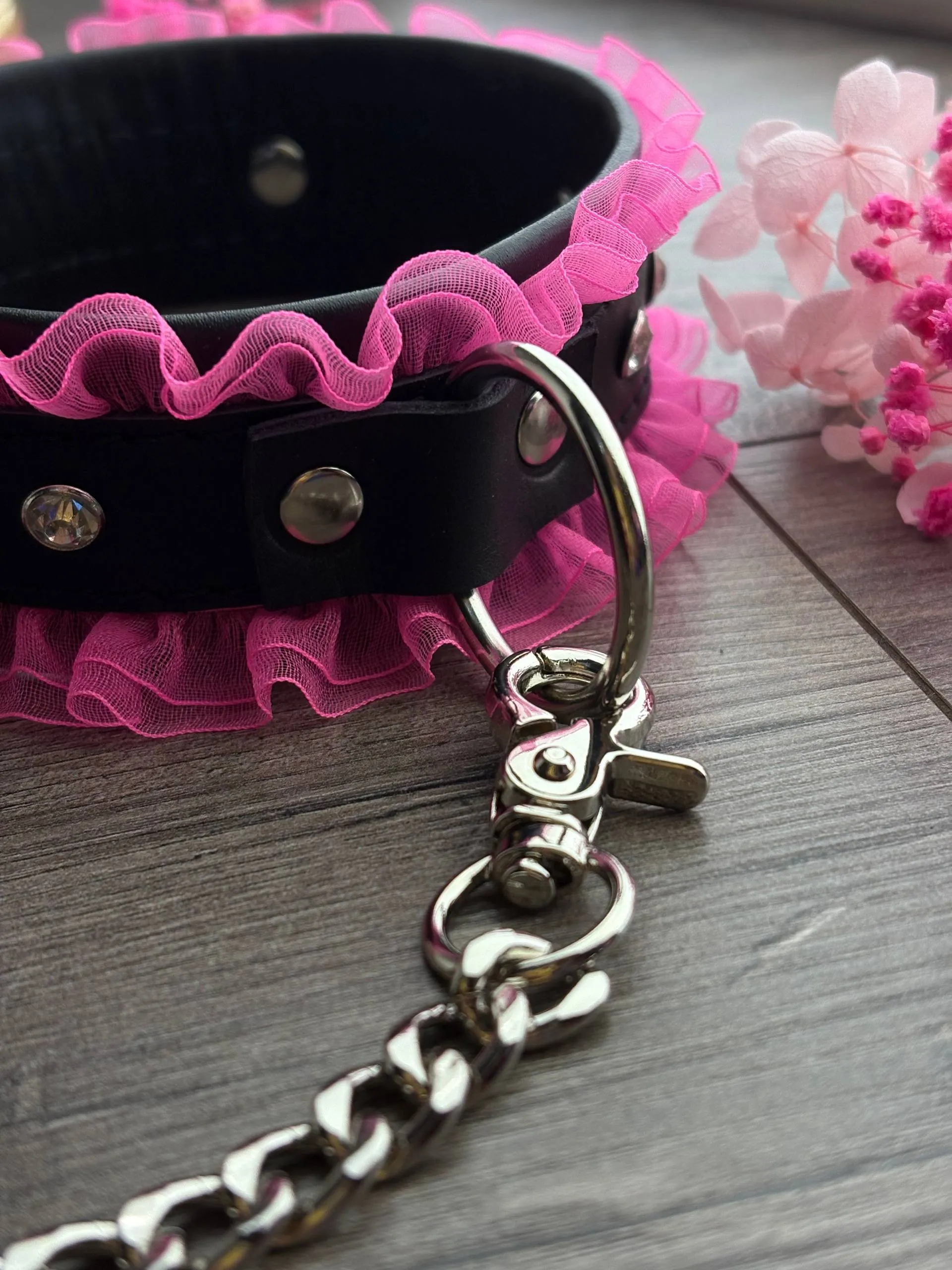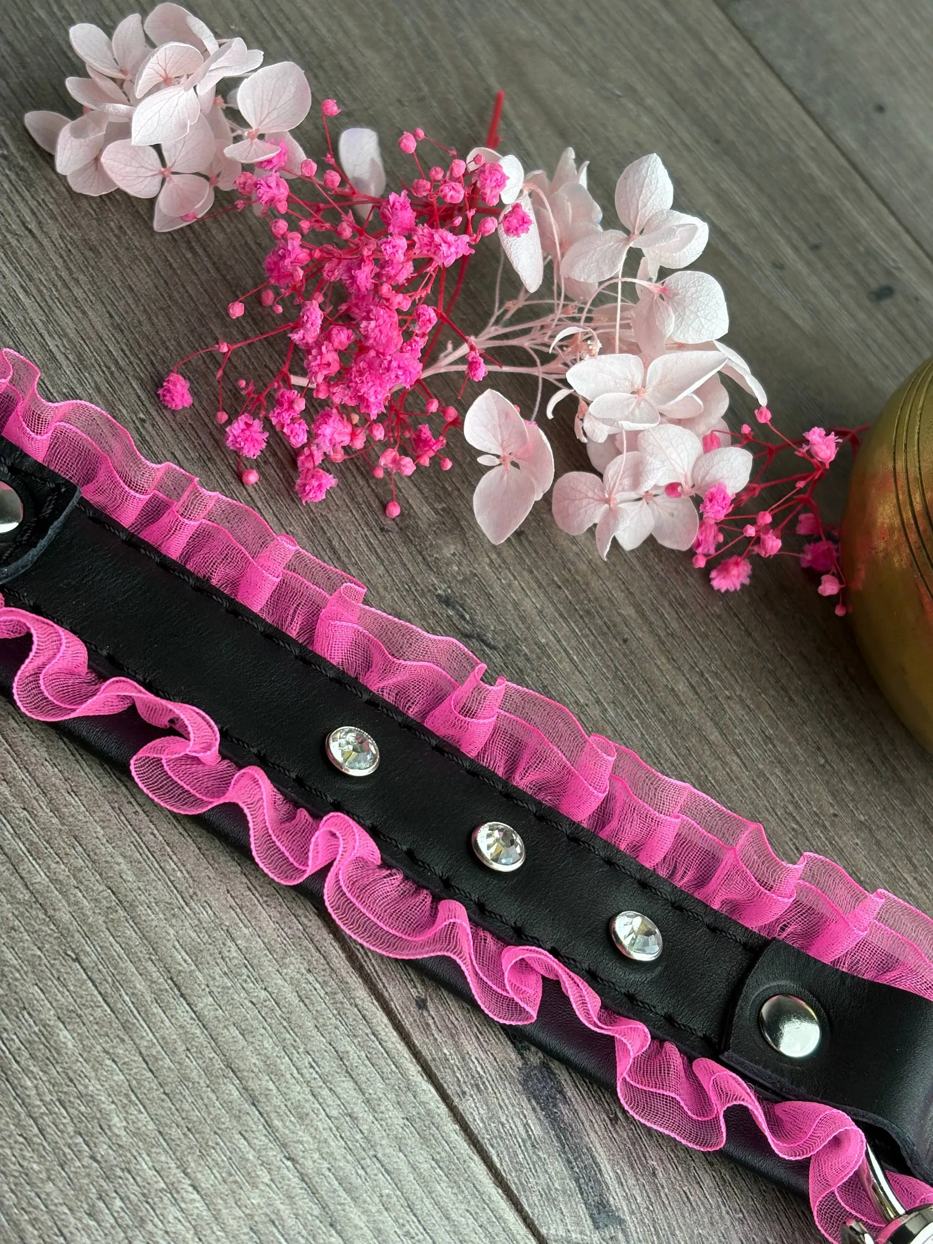 Oшейник черный кожа со стразами, розовый рюш