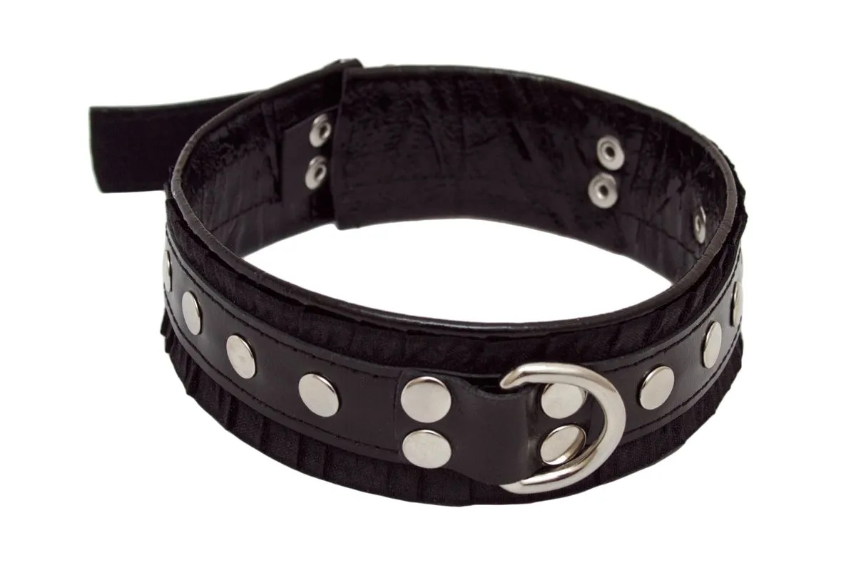 Ошейник от компании Индиго выполнен из натуральной кожи и декорирован рюшами и металлическими клепками. Такой аксессуар можно носить как в повседневной жизни, чтобы подчеркнуть свой уникальный стиль, так и во время ролевых игр для создания необходимого образа. На ошейнике есть специальное полукольцо, за которое при помощи карабина можно присоединить поводок. Поводок в комплект не входит.