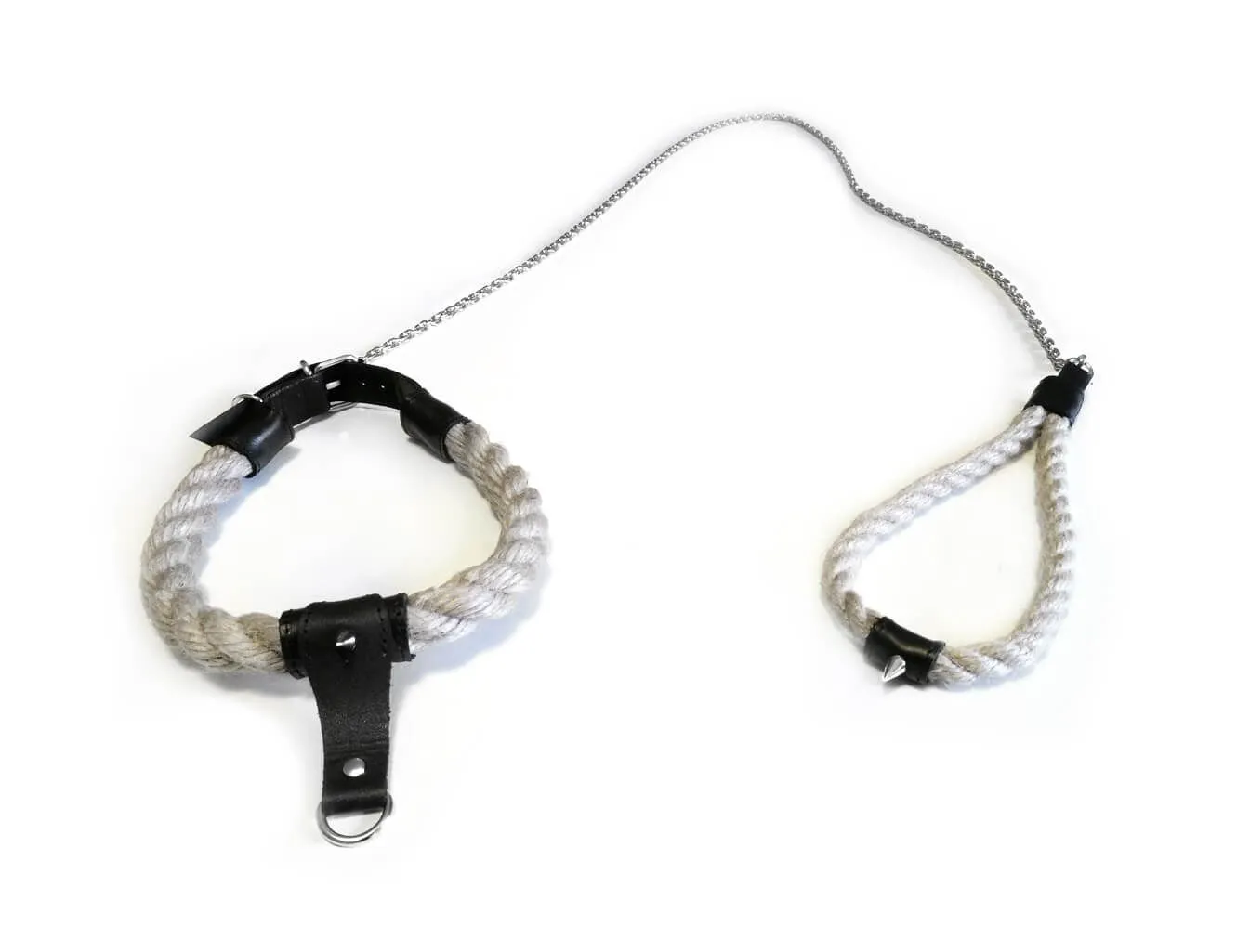 Поклонникам ролевых интимных игр с элементами БДСМ понравится этот витой ошейник со вставками из натуральной кожи, выполненный в необычном дизайне и напоминающий веревку. В комплекте с ним идет металллический поводок с удобной петелькой для запястья. Этот аксессуар позволит Вам подчинить себе своего партнера и в буквальном смысле слова держать его на коротком поводке. Благодаря наличию специальной кожаной петельки с небольшим кольцом, к ошейнику можно будет присоединять и другие БДСМ аксессуары, чтобы поэкспериментировать с различными вариантами фиксации.