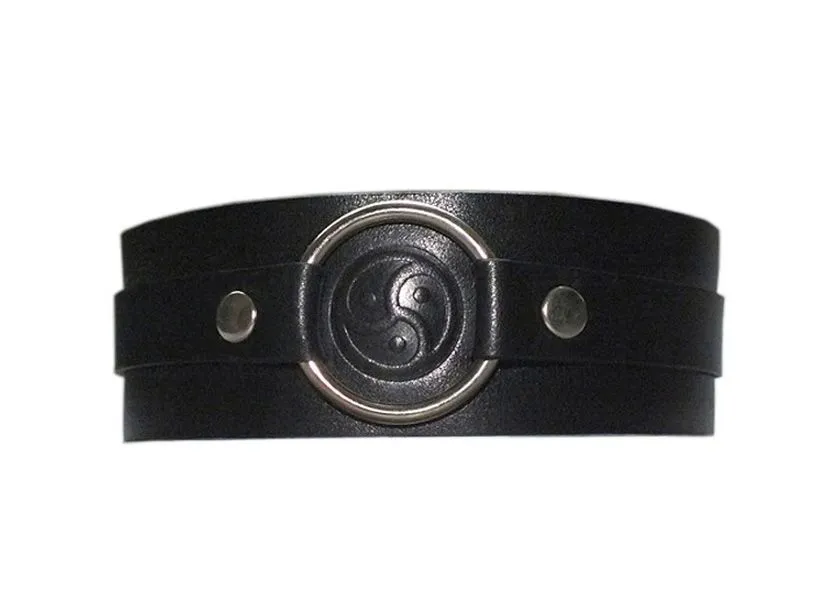 Ошейник производства российской компании "Подиум" сделан из натуральной кожи черного цвета и украшен клише с изображением трискеля - эмблемы движения БДСМ. На ошейнике есть крупное кольцо, к которому можно будет присоединять различные бондажные аксессуары или поводок. Это разнообразит сценарии игры и позволит паре найти новые позиции для фиксации. Также ошейник, надетый в дополнение к ролевому костюму, будет выступать символом подчинения.