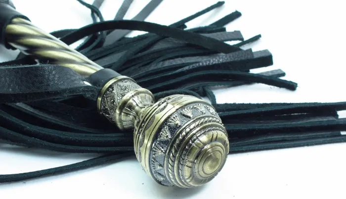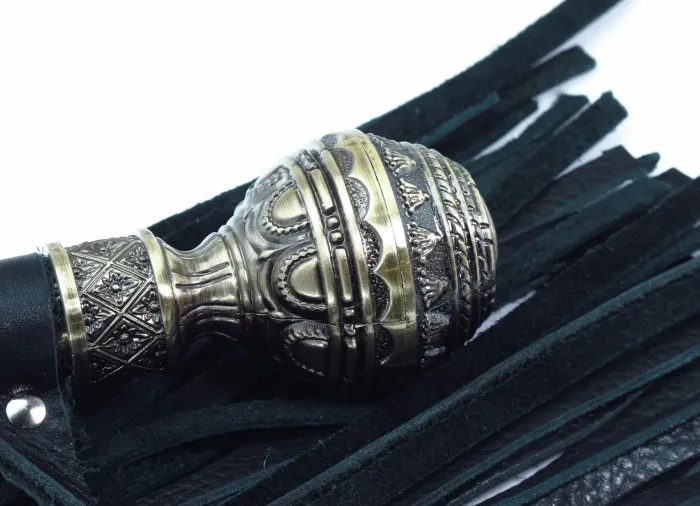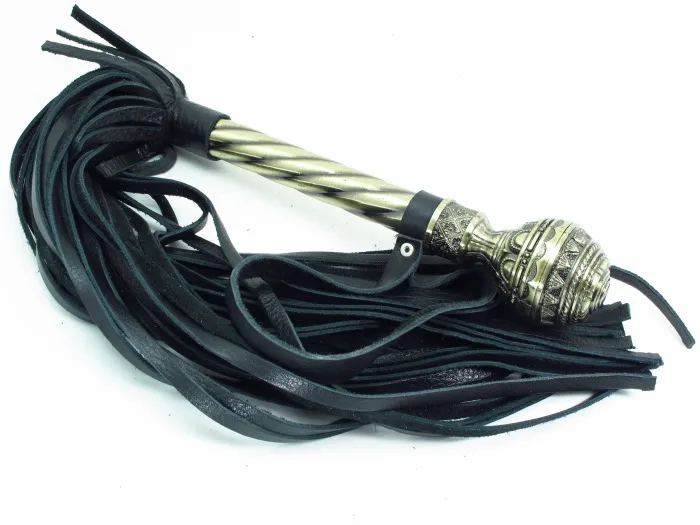 Плеть с рукояткой из натуральной кожи. Рукоятка из металла с резной, кованной ручкой и кожаным ремешком, Длина плети- 40 см, рукоятки- 23 см, ремешок- 16.5 см.