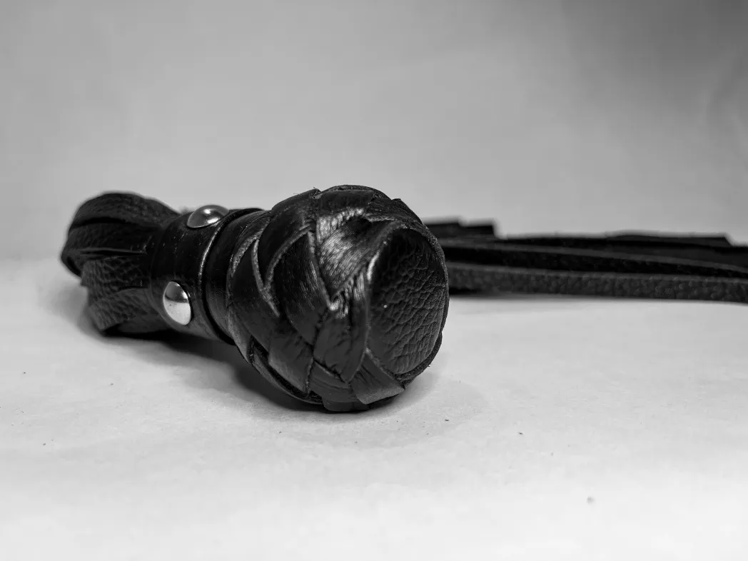Изящная генитальная плеть, выполненная из натуральной кожи чёрного цвета. Мини-рукоятка декорирована плетением и металлической фурнитурой, очень комфортно ложится в руку! Общая длина аксессуара 30см. Плеть очень красивая, стоит только взять ее в руки, и уже не хочется отпускать. Эта малышка добавит огня и новых впечатлений в любовную игру!