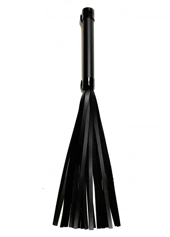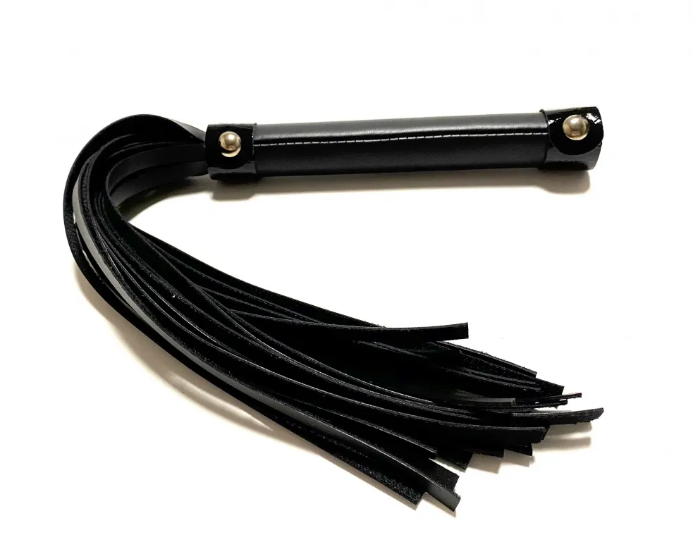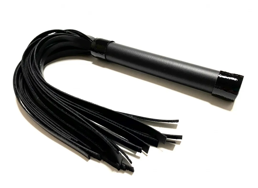 Стильная лаконичная плеть, выполненная из чёрной матовой эко-кожи. Рукоятка декорирована лаковыми полосками. Общая длина аксессуара 42см, диаметр рукоятки 2,5см. Эта плеть поможет разнообразить вашу БДСМ игру и подарит новые ощущения. Экономичный, экологичный и красивый аксессуар! Материал: эко-кожа, металл Цвет: черный