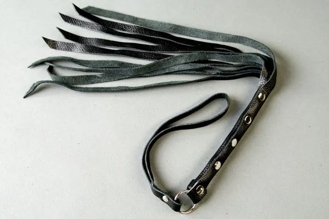 Флоггер состоит из 9 полос хромовой кожи, длина полос - 30 см, ширина полос - 1 см. Ручка - 15 см.