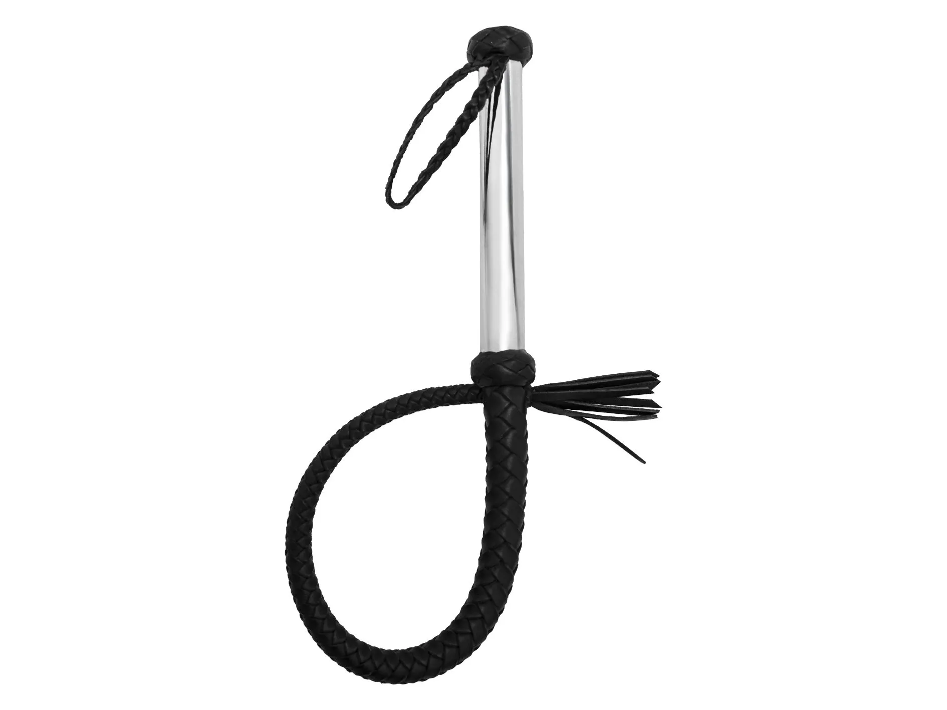 Длина 750 мм. (хромированная рукоять (200 мм.) с 2-мя ограничительными плетенными ,,бобышками,, и петлей для подвеса под нижней; переходящая в кнутовище на конус – 8-и полосное плетение ,,елочкой,, (550 мм.) – с узелком и 8-и полосной кисточкой (80 мм.) на конце. Натуральная кожа, металл.