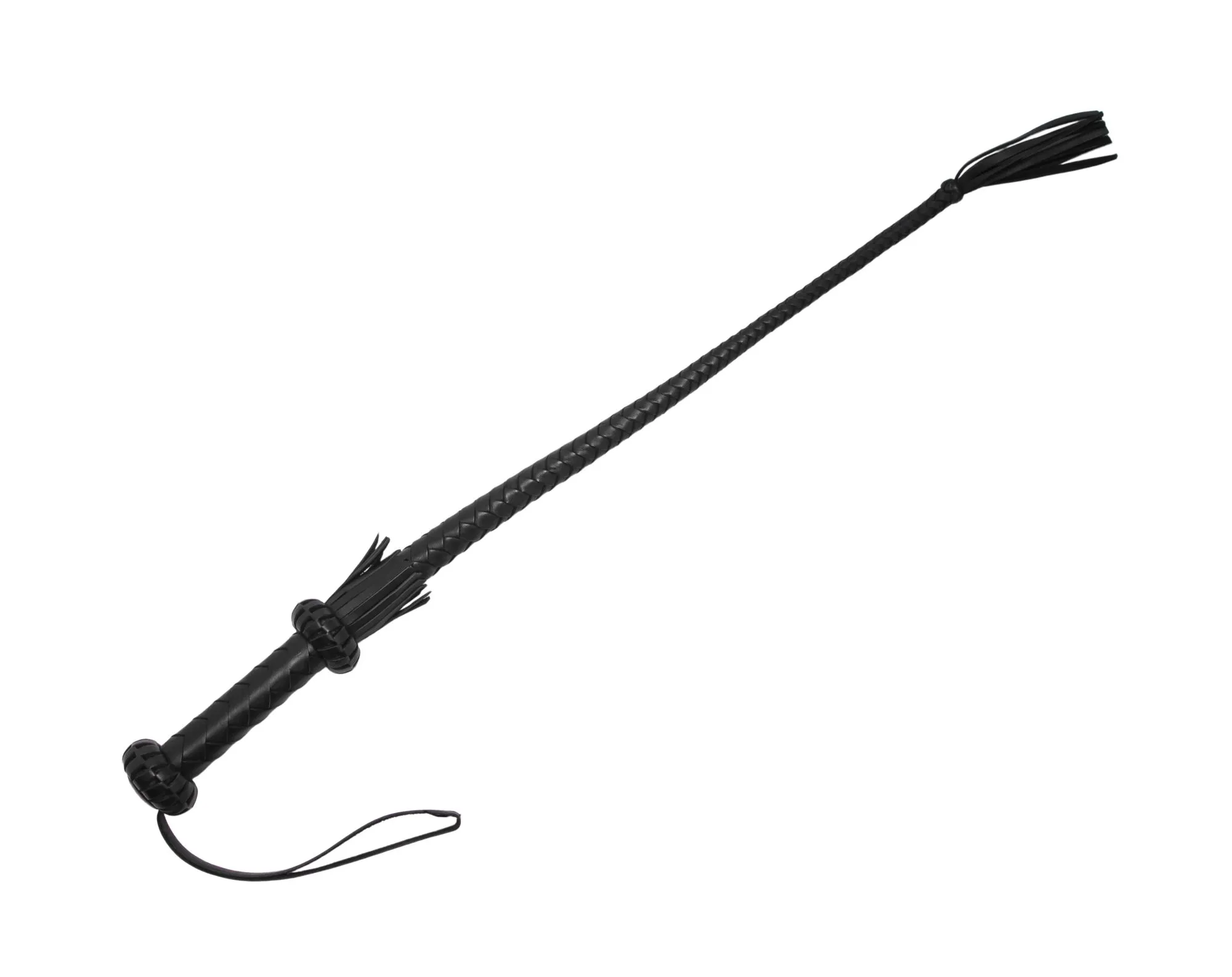 Кнут с жёсткой ручкой 190 мм, ограниченной двумя бобышками и с петлёй для фиксации руки. Общая длина 850 мм. Натуральная кожа. При изготовлении кнута использовалось восьмиполосное плетение "елочкой". На его конце есть узелок и короткая кисточка, которую можно будет применять как для нанесения ударов, так и для дразнящих поглаживаний. Используйте этот аксессуар для нанесения ощутимых ударов, чтобы партнер прочувствовал все силу Вашей любви.