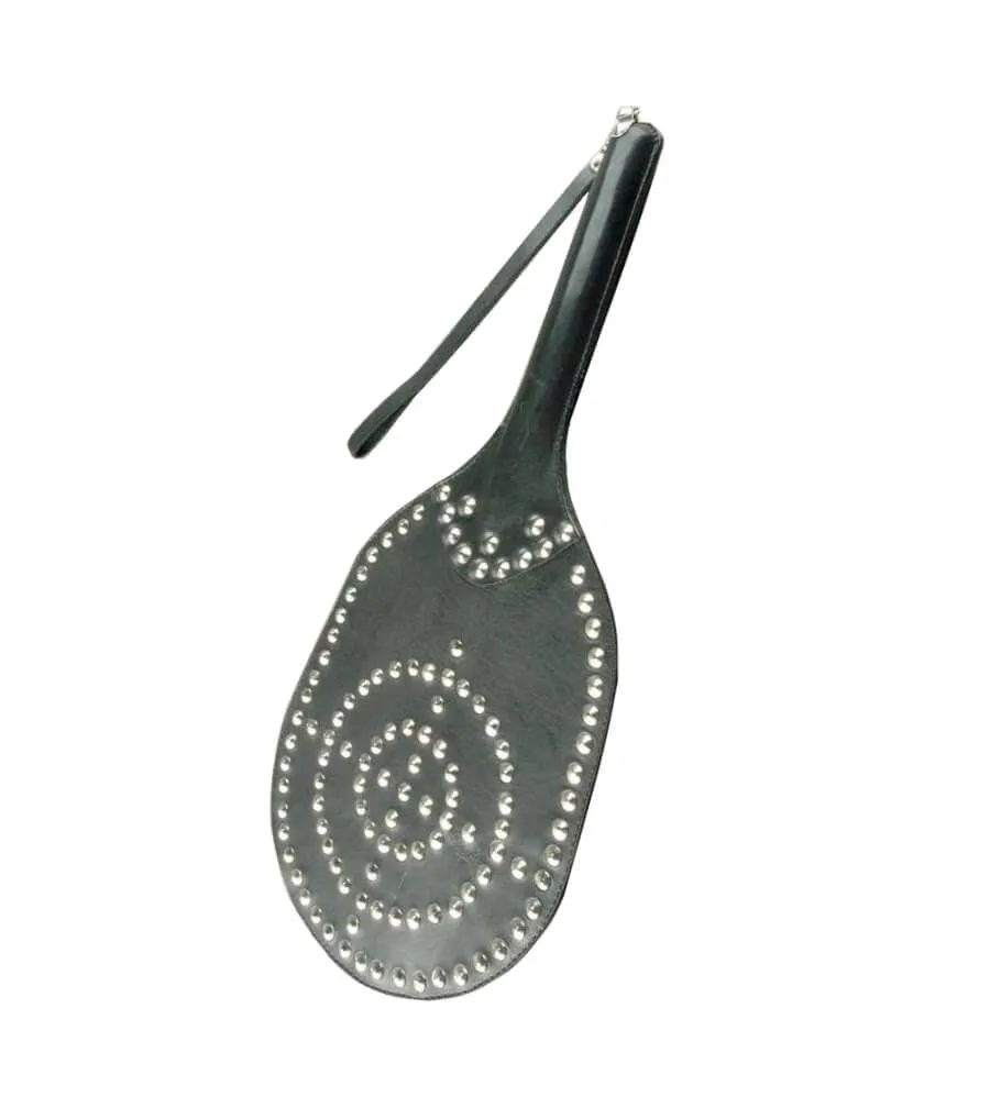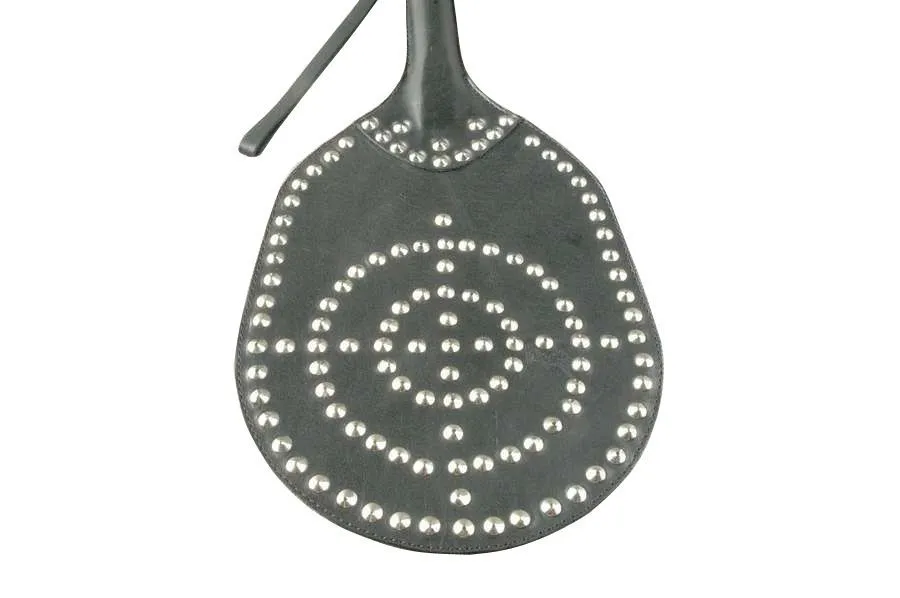 Оригинальная шлепалка "Пинг понг мишень" от бренда Beastly сделана в виде ракетки и декорирована металлическими элементами, образующими узор в виде мишени. Удар такой шлепалкой станет настоящим испытанием, которое сможет подарить острое удовольствие. Обратная сторона гладкая и не имеет фурнитуры, поэтому ей можно наносить менее чувствительные удары. Шлепалка сделана из натуральной кожи черного цвета. На ручке есть петелька для фиксации на запястье.