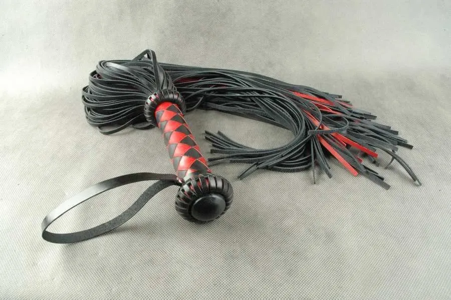 Плеть "Грешница" от бренда Beastly состоит из 115 полос с прямым резом на концах и плетеной рукояти, украшенной ограничителями в виде "фонариков." Такой аксессуар позволит Вам со всей страстью наказать своего партнера и преподать ему пару уроков послушания. Плеть сделана из натуральной кожи черного и красного цветов средней жесткости. На рукояти, плетенной 6 широкими полосами ромбом, есть петля для фиксации плети на запястье.