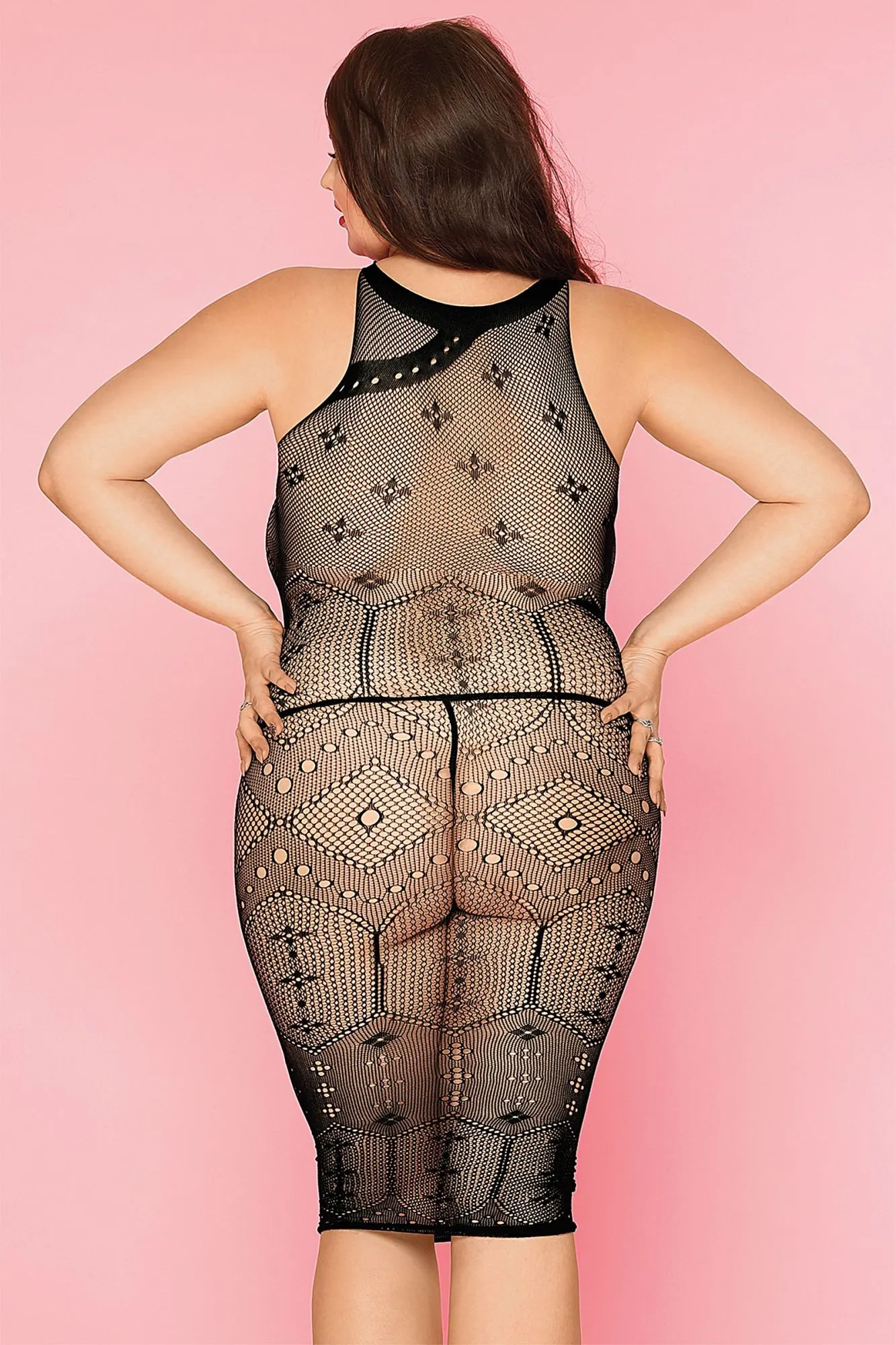 Эластичное бесшовное платье из сетки Spice от Candy Girl® с абстрактным рисунком плетения приковывает внимание к декольте. Длина до середины колена подчеркивает соблазнительный изгиб лодыжек. Стринги в комплекте.