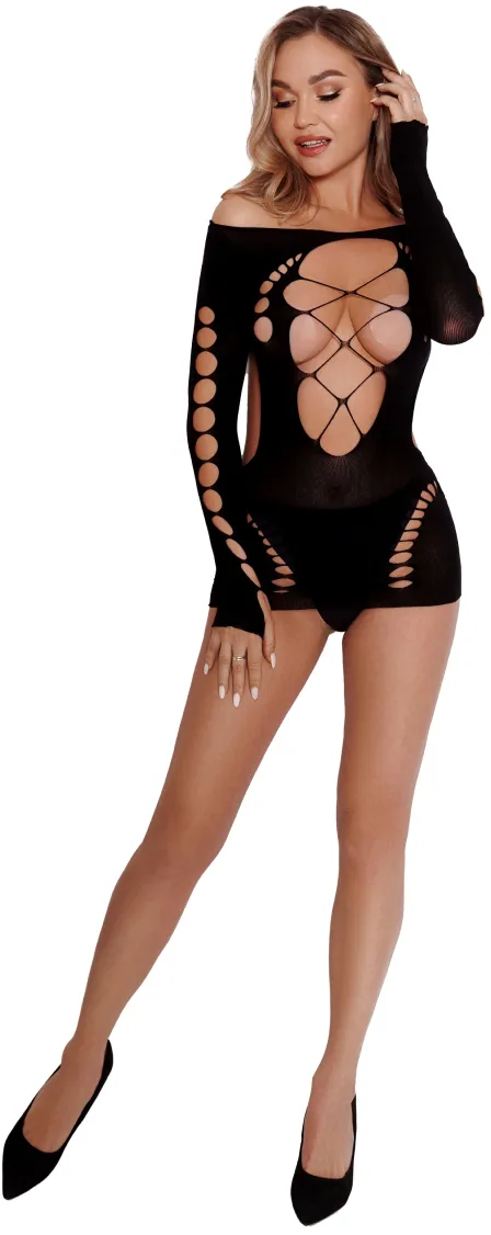 Откровенное мини-платье с длинными, спущенными с плечей рукавами и вырезами в виде шнуровки на груди и ягодицах.