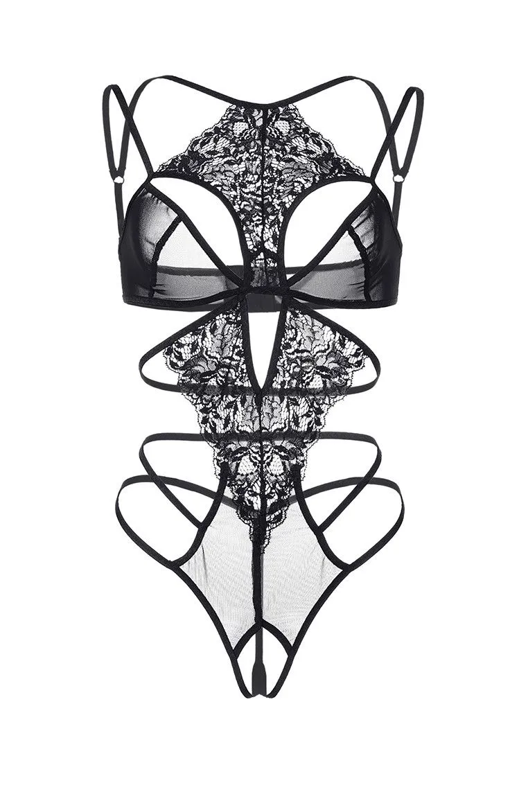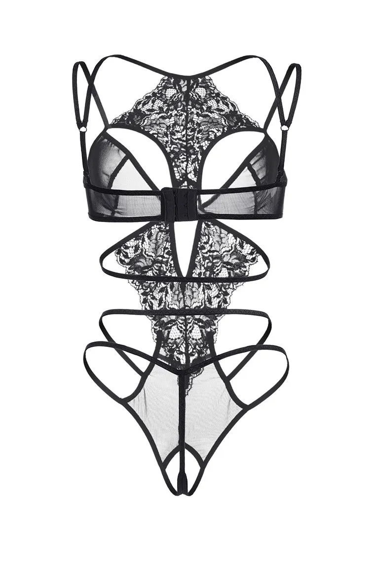 Эротическое боди из эластичной сетки со вставками кружева со свободным краем. Фигурные вырезы открывают верхнюю часть груди. Регулируемые бретели и застежка на спине.