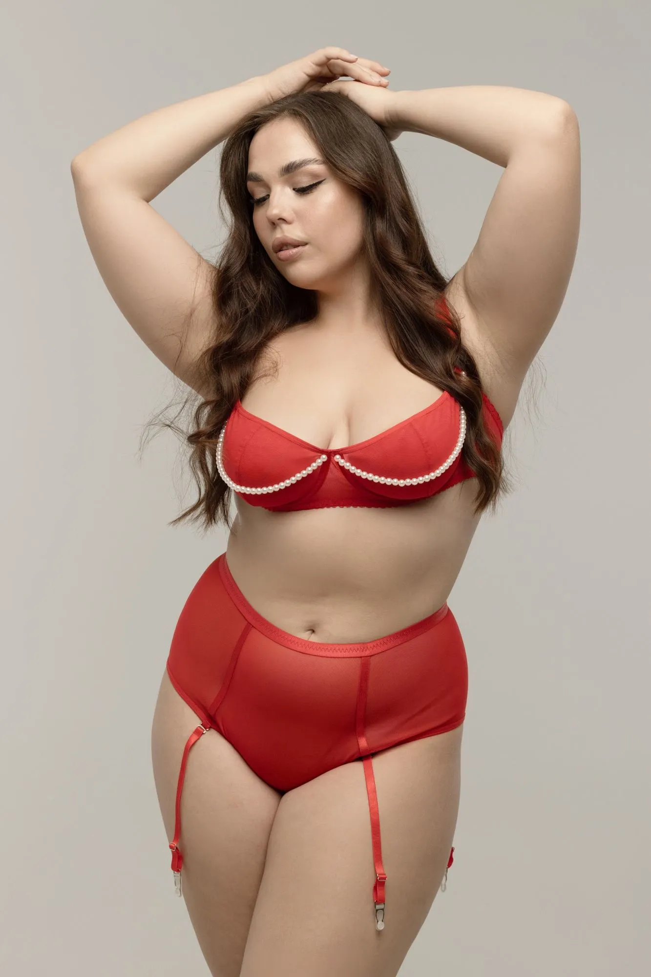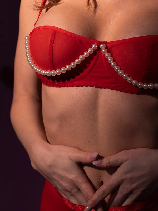 Бюстгальтер Lapin Rose Pearl - красный роскошный предмет нижнего белья, украшен нитями жемчужных бусин. Крой бюстгальтера выгодно подчёркивает округлость груди, соблазнительно приоткрывая её верхнюю часть.