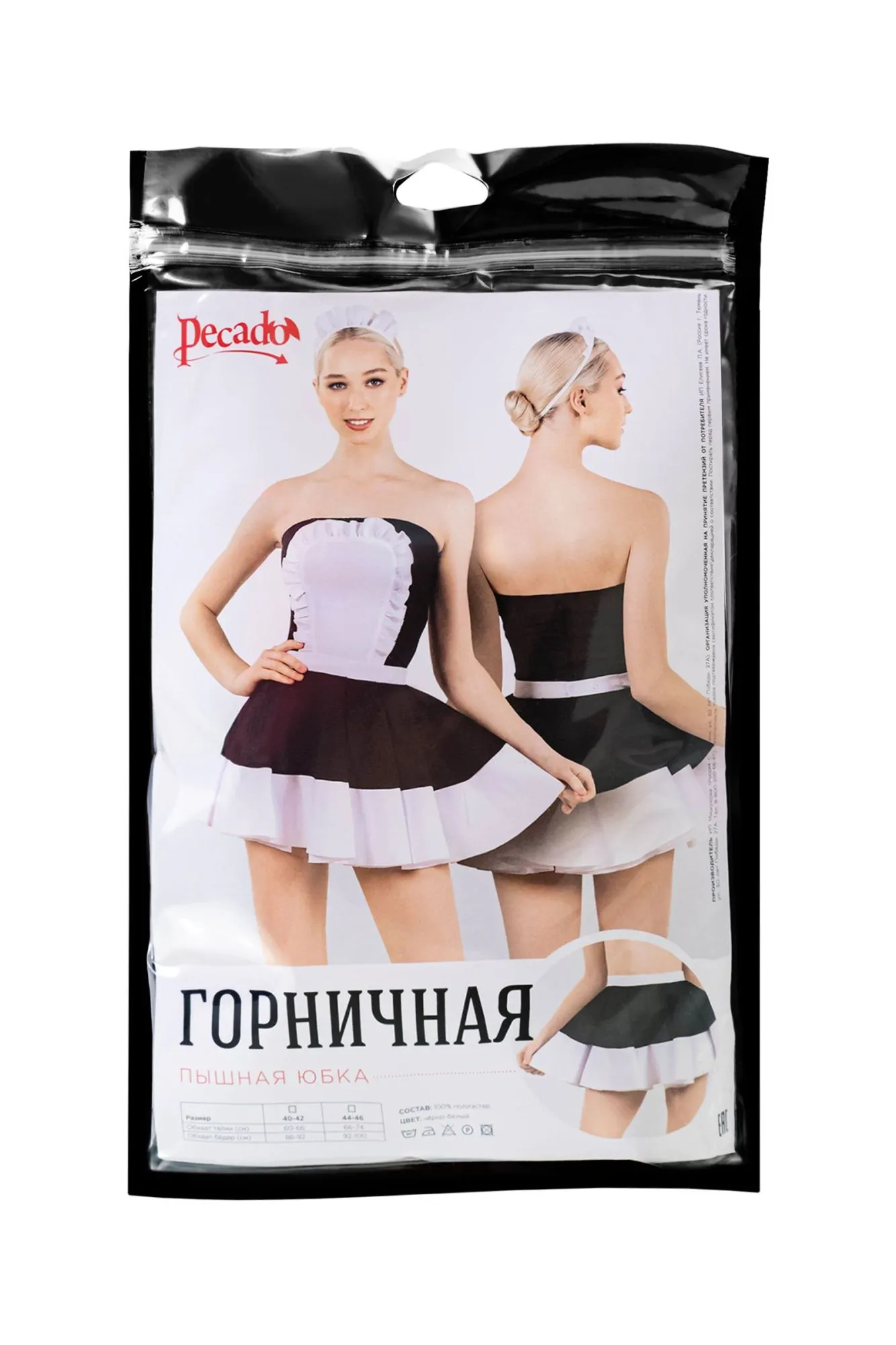 Нижняя и верхняя часть комплекта приобретаются отдельно. Именно так, Вы сможете подобрать для себя оптимальный размер. Эротический костюм соблазнительной горничной от Pecado только для тех, кто жаждет ярких красок в интимной жизни! Нижняя часть комплекта представлена эффектной пышной юбкой в классических черно-белых оттенках. Максимально дерзкая длина позволяет с огромным удовольствием наслаждаться приятным видом на аппетитные бедра и ножки. Юбка выполнена из качественной износоустойчивой ткани. Она почти не мнется и очень приятна к телу. Изящные складки по всей поверхности добавляют образу особого игривого настроения. Воплощайте все свои фантазии, вместе с Pecado. ● Состав комплекта – пышная юбка. ● Материал – 100% полиэстер. ● Качественная фурнитура. ● Цвет – белый, черный. ● Сделано в России. ● Размерный ряд 40-42, 44-46 (Соответствует Российской размерной сетке).