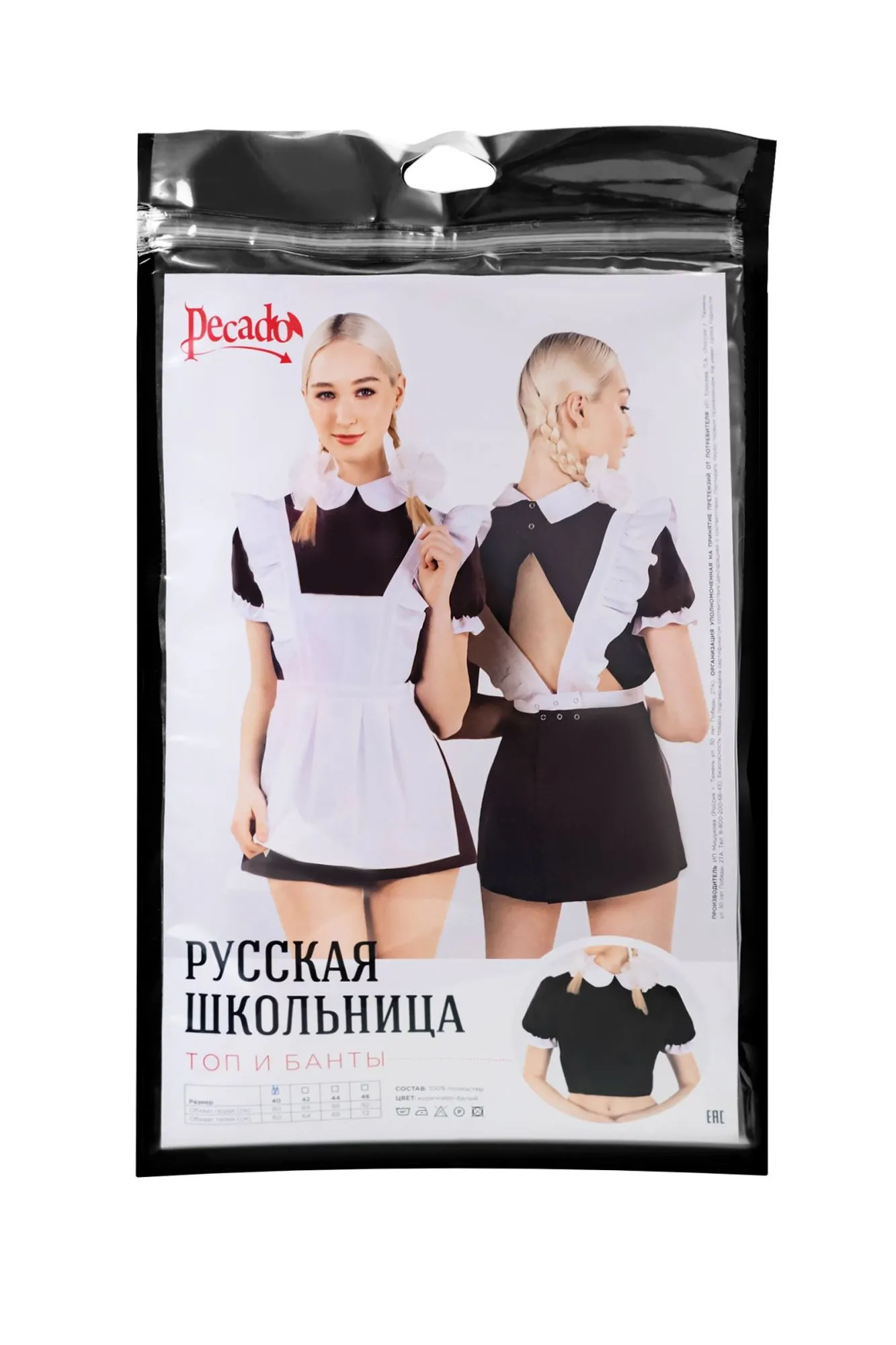 Нижняя и верхняя часть комплекта приобретаются отдельно. Именно так, Вы сможете подобрать оптимальный размер. Эротический костюм русской школьницы от Pecado создан для Ваших самых чувственных ролевых игр! Темный топ, из которого выполнена верхняя часть комплекта, состоит из полиэстера. Материал нежный, приятный, износостойкий. Топ легко и быстро надевается, фиксируется с помощью застежек сзади. Также, благодаря металлической фурнитуре, соединяется с нижней часть костюма. Кокетливый вырез на спине открывает притягательный обзор и возбуждающий полёт фантазий. Быть школьницей, готовой к любым сексуальным урокам легко! Вместе с эротическим костюмом от Pecado. ● Состав комплекта – топ, банты. ● Материал – 100% полиэстер. ● Качественная фурнитура. ● Цвет топа - коричневый, цвет бантов - белый . ● Сделано в России. ● Размерный ряд 40, 42, 44, 46 (Соответствует Российской размерной сетке).